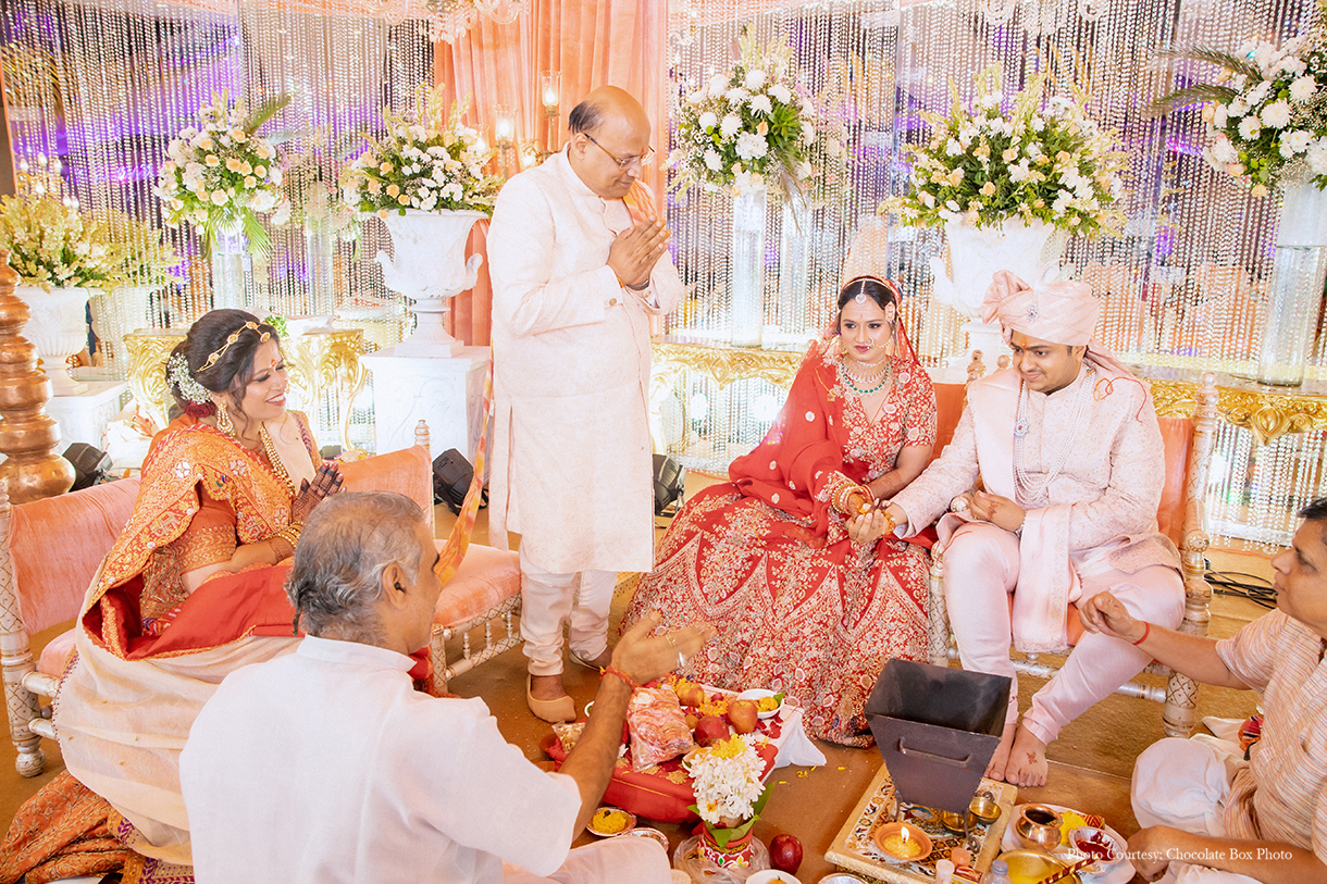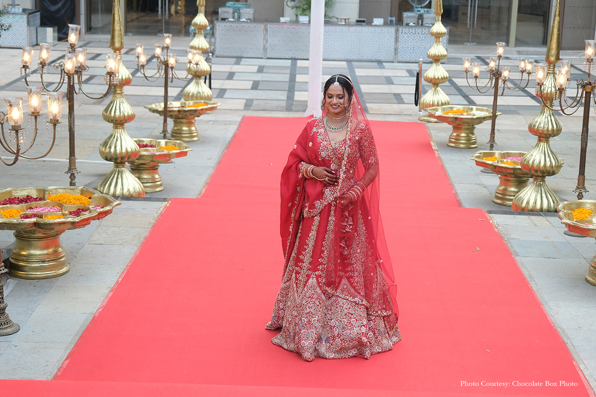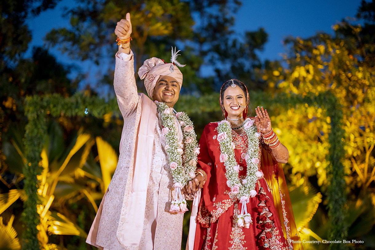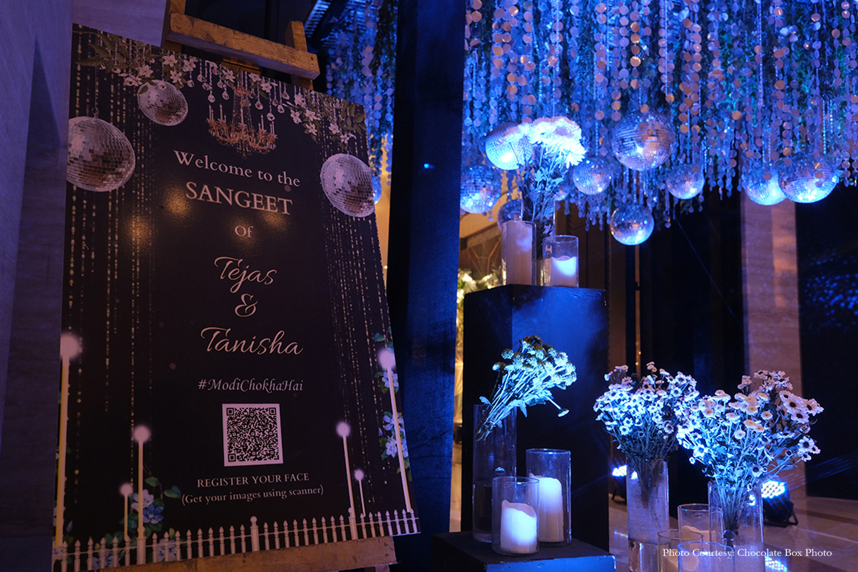 Under a canopy adorned with peach drapes, exquisite chandeliers, and floral vases, Tanisha and Tejas exchanged vows in a setting of timeless beauty. A bespoke photo booth, featuring the hashtag ‘Modi Chokha Hai,’ captured cherished memories for guests to take home. During the solemn sindoor ceremony, all guests reverently rang bells, amplifying the sanctity of the moment and the couple’s union.