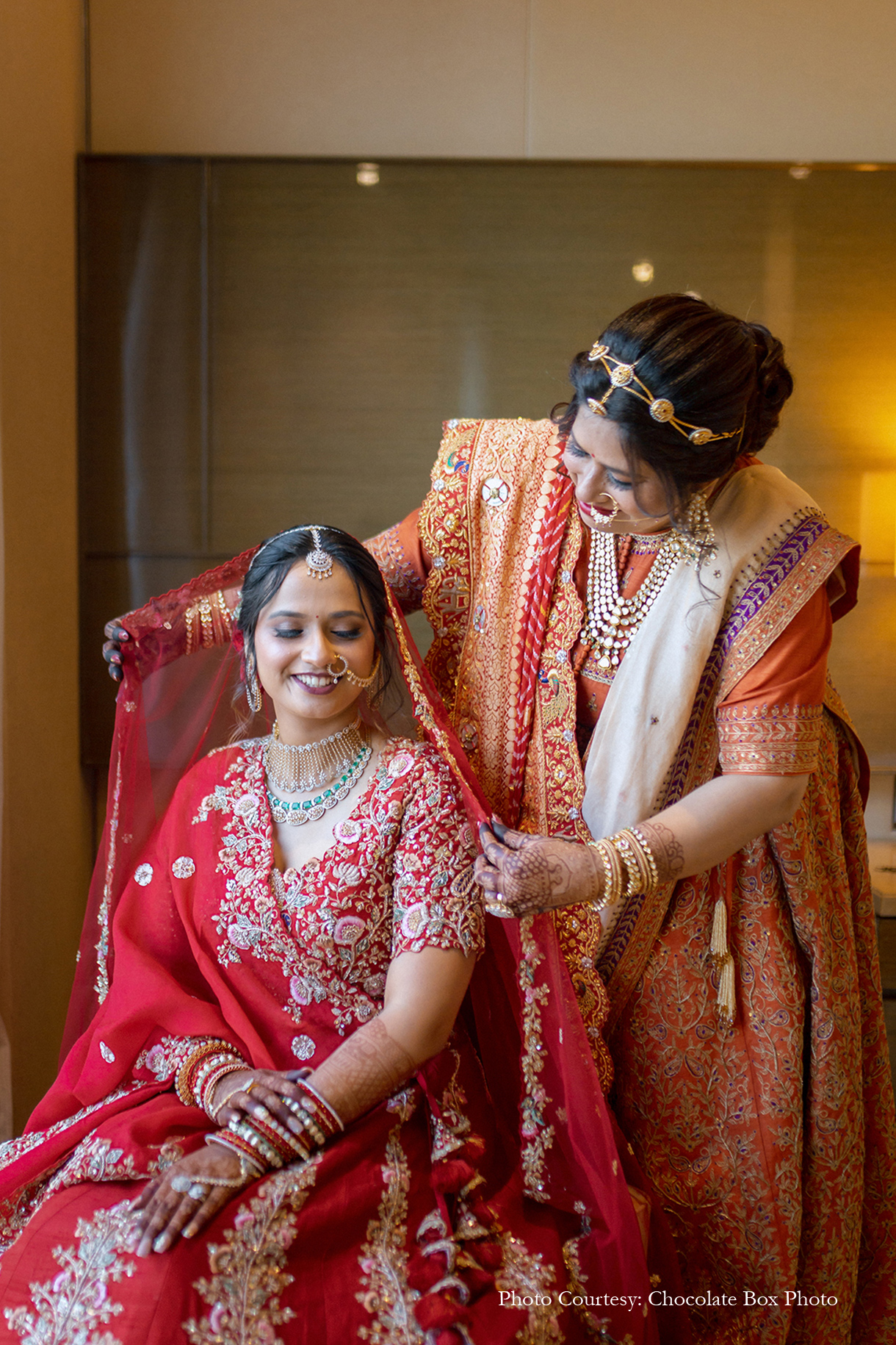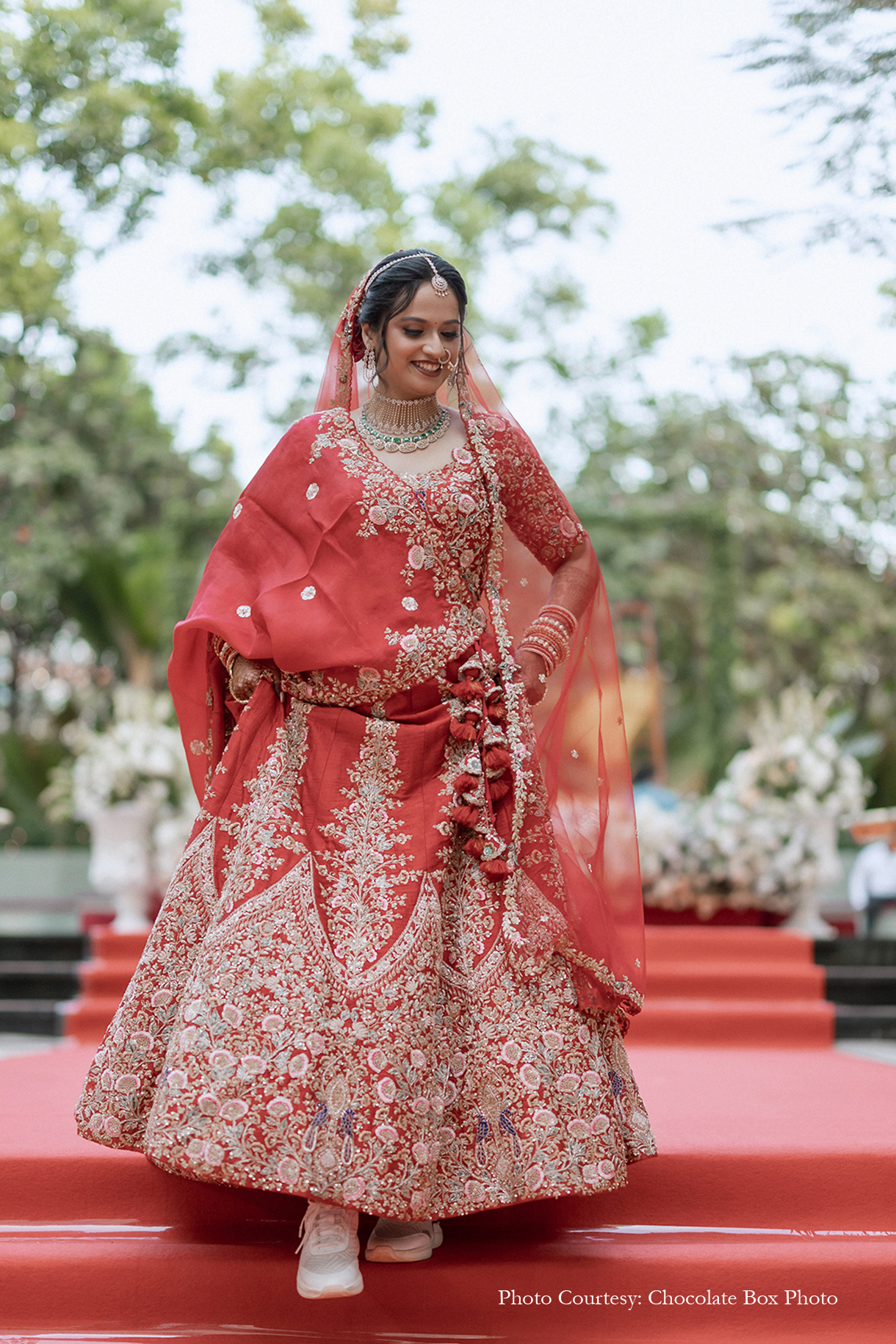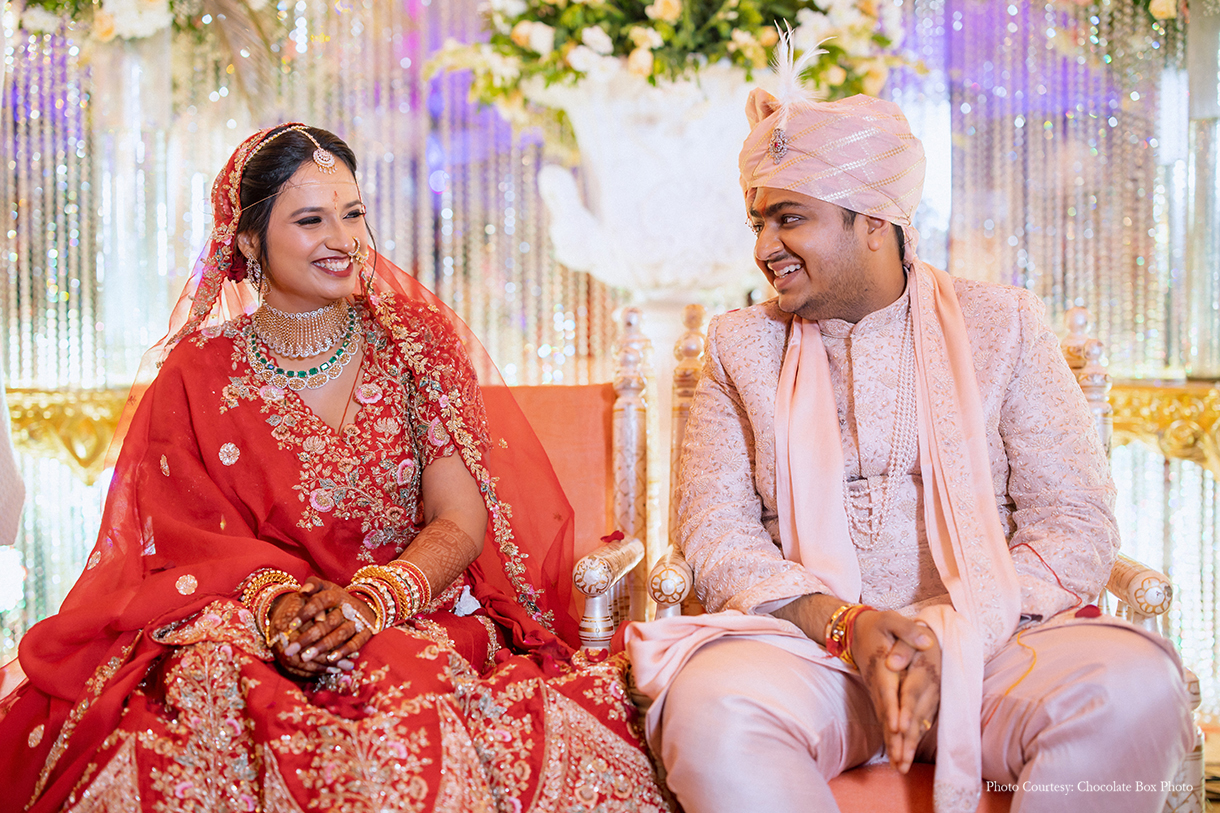 Under a canopy adorned with peach drapes, exquisite chandeliers, and floral vases, Tanisha and Tejas exchanged vows in a setting of timeless beauty. A bespoke photo booth, featuring the hashtag ‘Modi Chokha Hai,’ captured cherished memories for guests to take home. During the solemn sindoor ceremony, all guests reverently rang bells, amplifying the sanctity of the moment and the couple’s union.