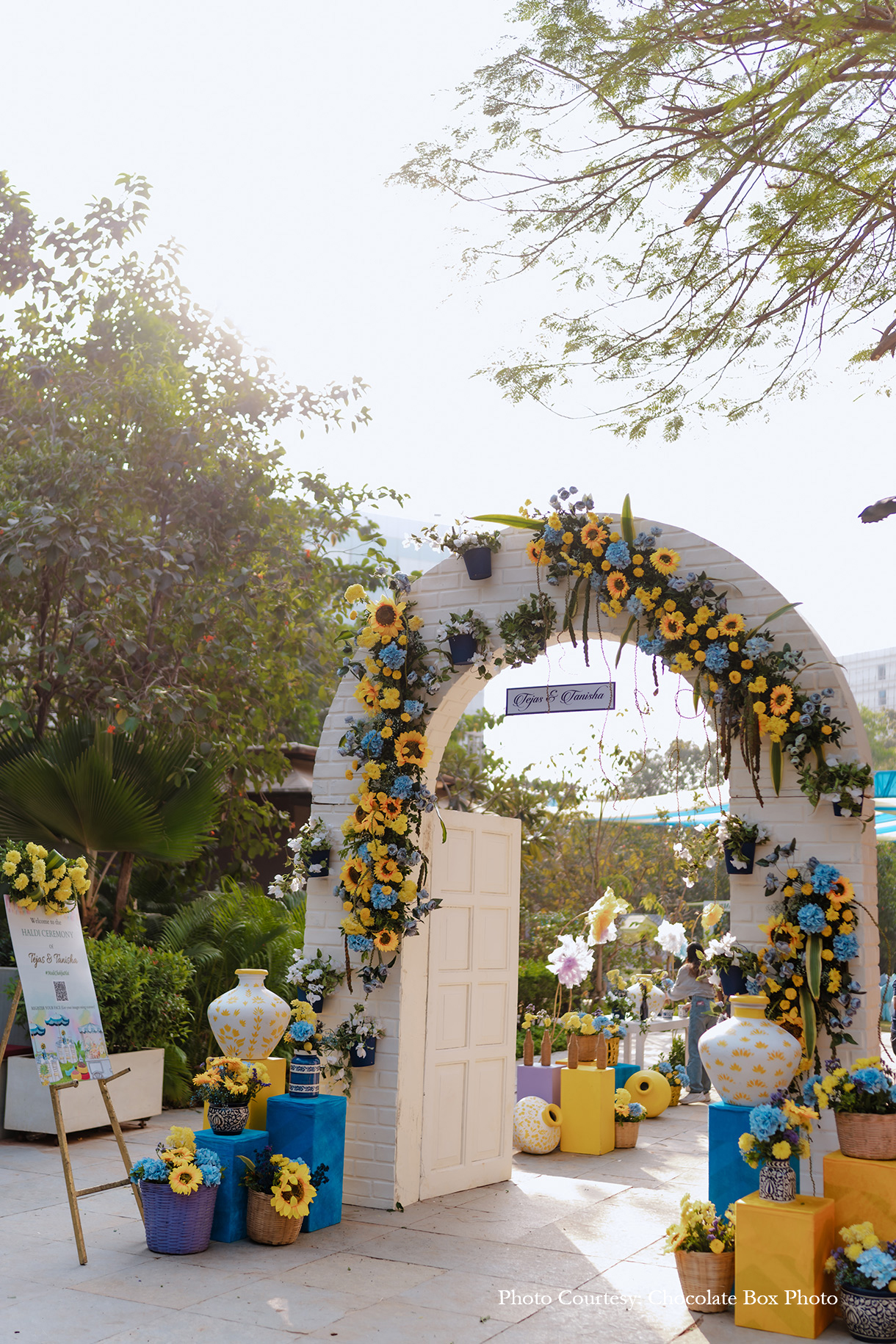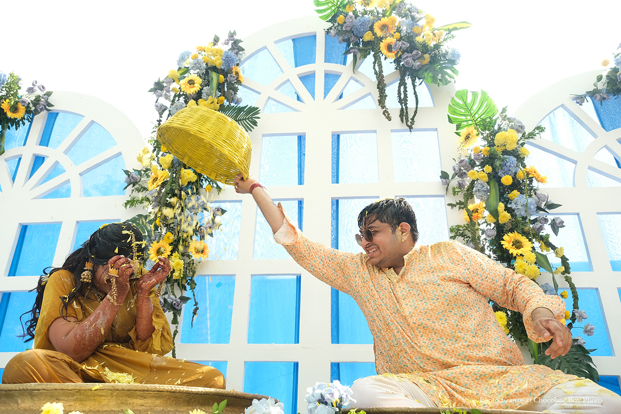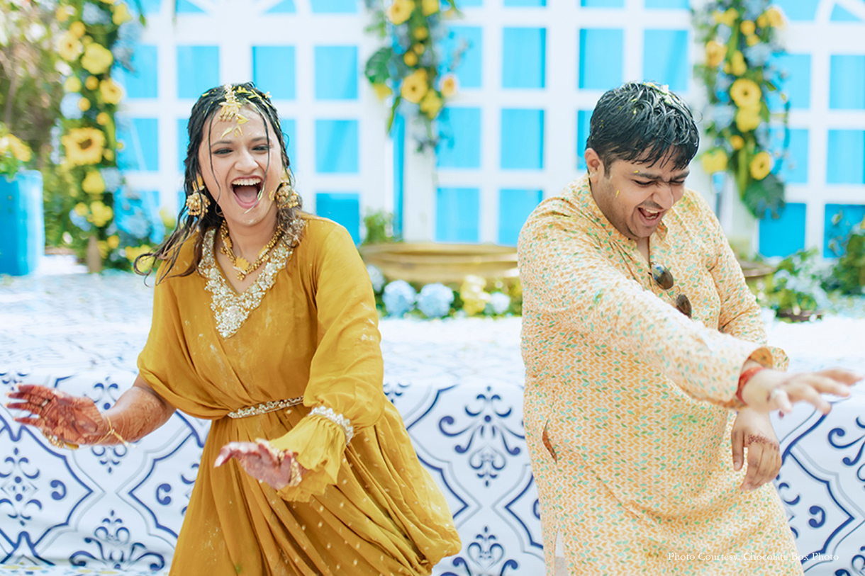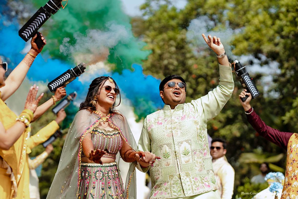 The vibrant festivities commenced with the Haldi ceremony, graced by colorful smoke guns held by their cherished friends and family. Accompanied by the lively beats of the dhol, the couple made a joyous entry to the stage. Amidst the summer heat, guests relished popsicles, slurpees, and popcorn from a charming cart, while engaging in fun games hosted by a lively MC. The wedding’s social media managers captured spontaneous choreography at the photo booth, adding to the event’s vibrancy, complemented by spirited performances from the family.