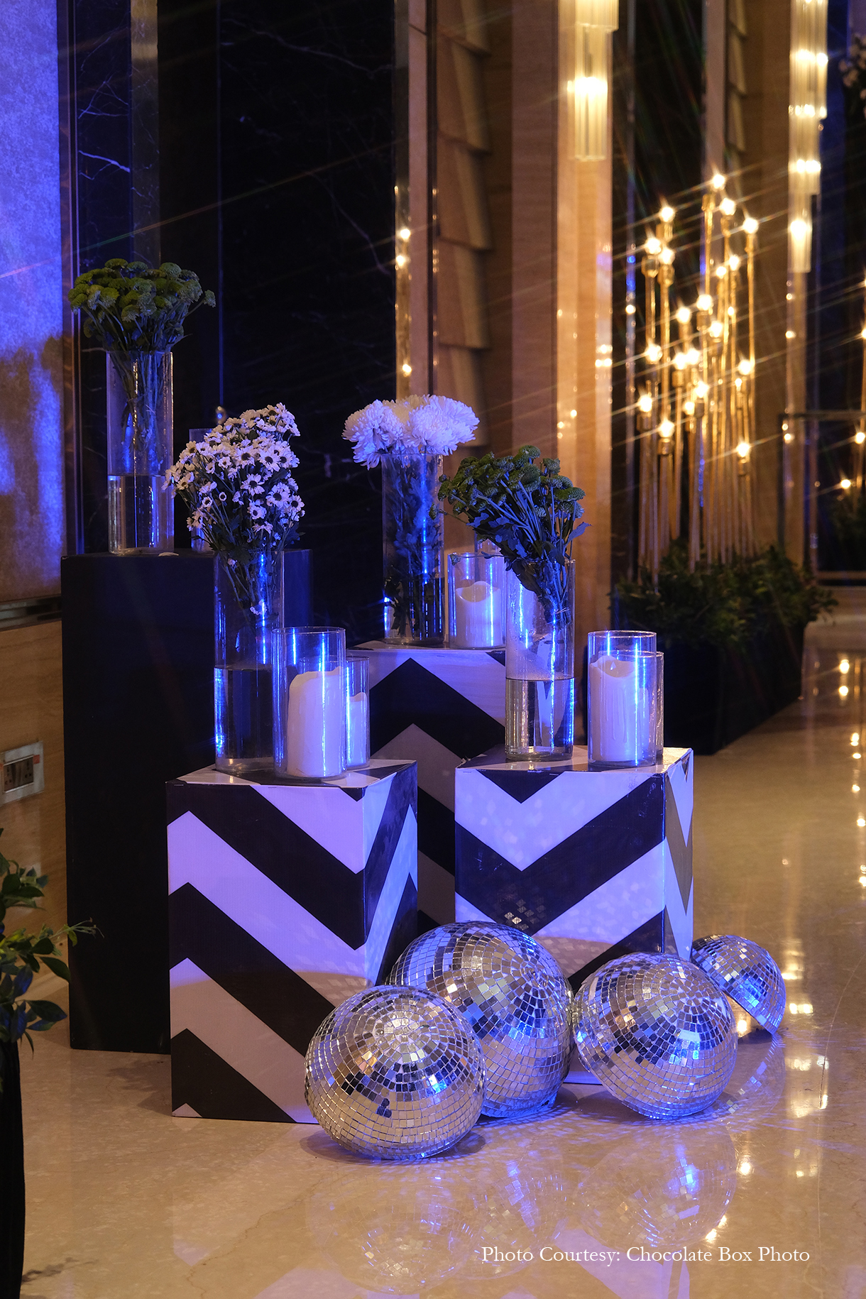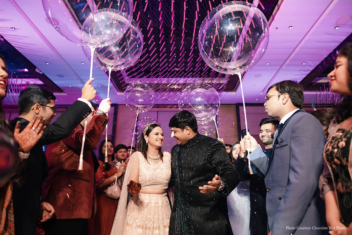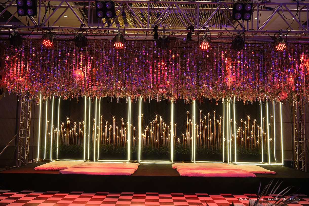 Transforming the ambiance with lush greens and dazzling disco balls, the Sangeet night was a vision of elegance. LED arches illuminated the pathway to the stage, meticulously managed to perfection as per the groom’s discerning taste. The couple’s grand entry, guided by LED balloons and accompanied by LED dhols, evoked a magical atmosphere. Smoke bubbles and mist enhanced the dance performances, creating mesmerizing visual effects that touched the hearts of the couple, their parents, and the guests.