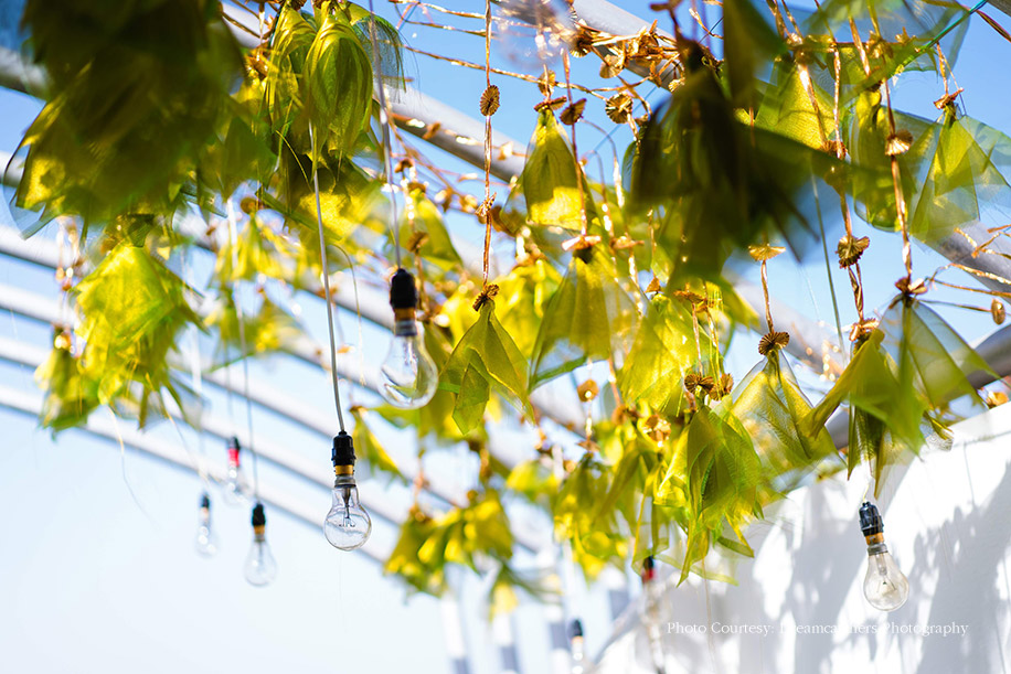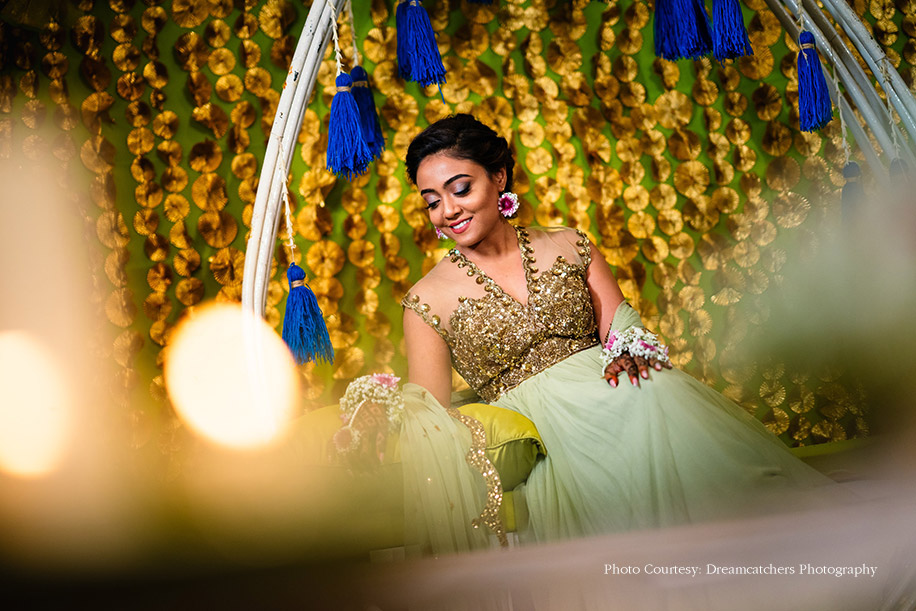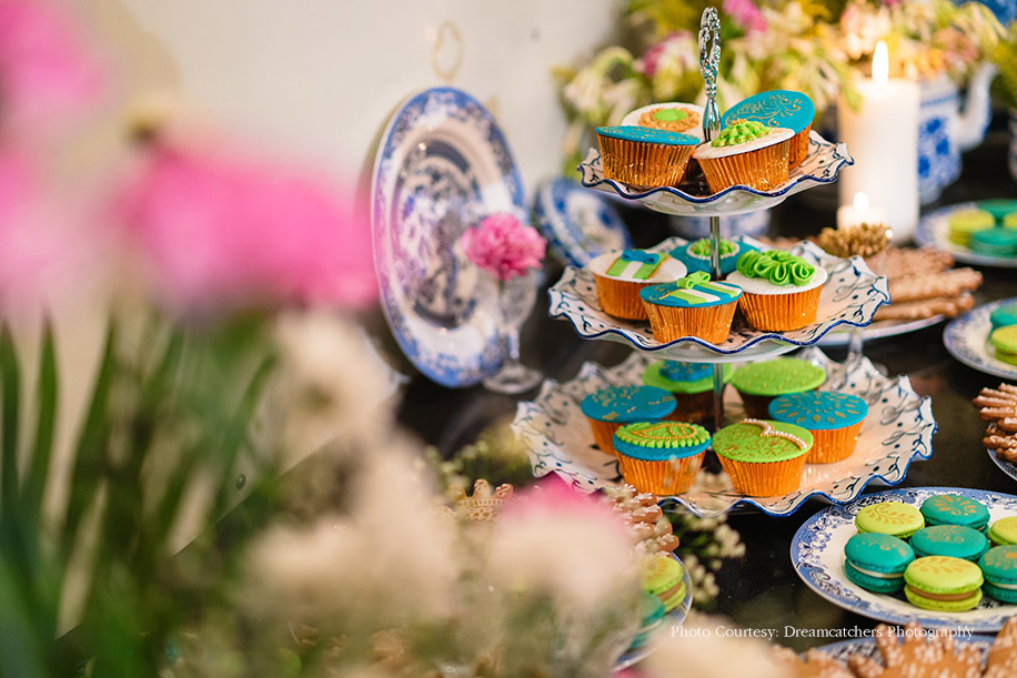 “I was heavily involved in the process of planning the decor for our mehndi as it was our first wedding function, and I wanted it to be intimate yet extravagant. We used gota patti elements along with green fabrics hangings, filament lights, and chandeliers to enhance the beauty of the space. We incorporated touches of blue through tassels and decorative ceramic pieces sourced by me. We added benches for a casual seating vibe. Some customized cupcakes, macaroons, and cookies shaped like little hands with mehndi designs were laid out for our guests, and they looked quite decorative.”