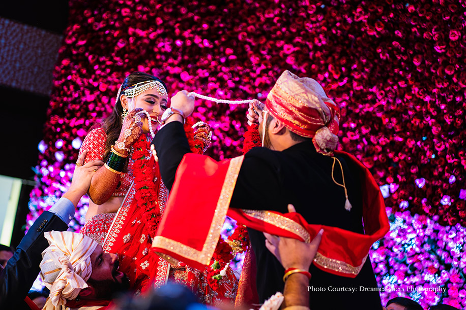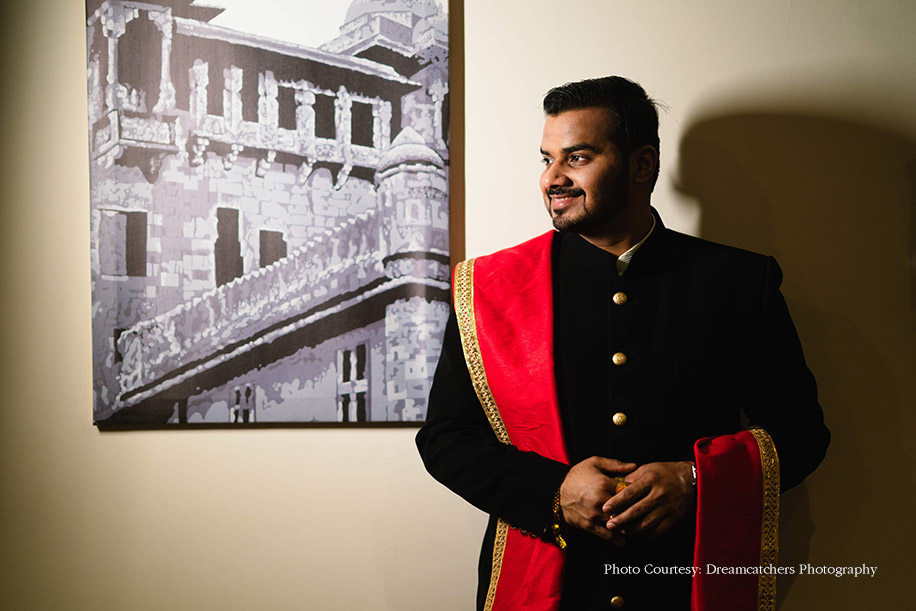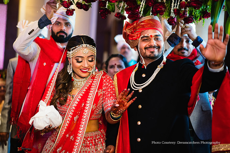“Our wedding was followed by a reception for which the backdrop of the stage was embedded with abundant blooms. The path to the venue was lined with arches draped with rich velvet, and I made my entry under a floral canopy. For this function, I wore a red lehenga by Anita Dongre while Mandar opted for a black achkan.”