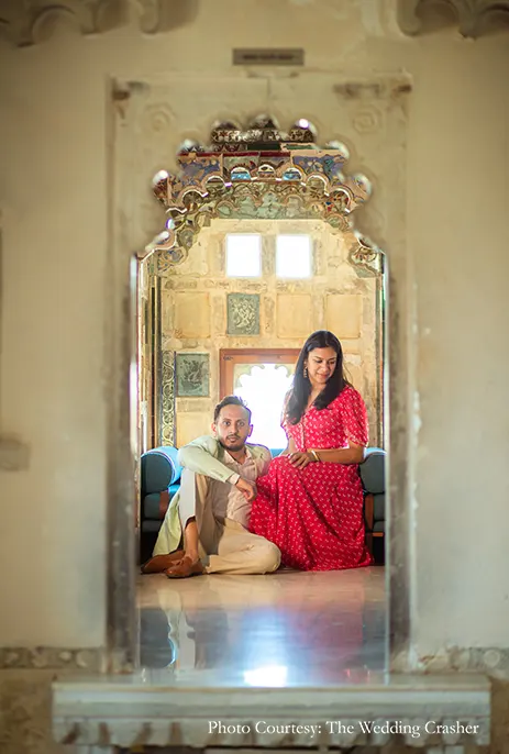 The couple decided to host an intimate destination wedding at the stylish RAAS Devigarh that boasts of 39 cool suites. The festivities at this imposing hill-side venue overlooking a village were planned by Trailblaze Productions, and the task of capturing their special moments was entrusted to the team of The Wedding Crasher. The couple share, “We had a great time working with The Wedding Crasher, they captured every moment special to us and the overall experience was seamless.”