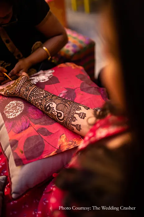 The wedding functions kicked off with a vibrant carnival-themed mehndi. The bride wore a bright fuchsia palazzo set for the occasion, as she got her hands painted with beautiful henna designs, while the groom kept it breezy in chinos, a white shirt, and a mint day blazer. The function was followed by the engagement ceremony under the stars.