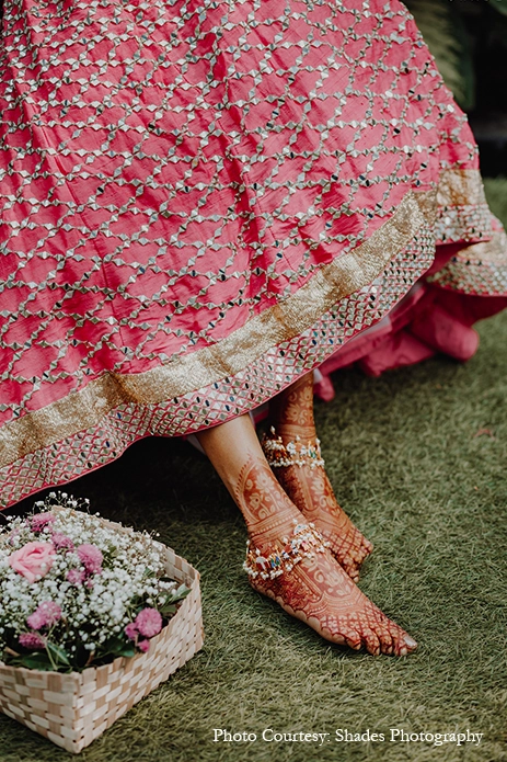 “I wore a stunning tropical print lehenga that featured a pink sequin bustier blouse and a feather-light nude crepe lehenga skirt with foliage digital print.” Describing her customised mehndi design, she adds, “Aksha Shah was extremely accommodating and her team customized a mehndi design especially me. In the design, I included milestones from Kelvin and my relationship like a Goa skyline that included a church, a beach landscape, some of our favorite delicacies, and of course, the logo of Kelvin’s favorite football team – Manchester United! Everyone was in awe of the mehndi design.”