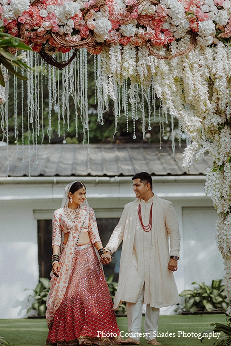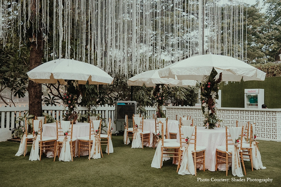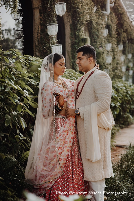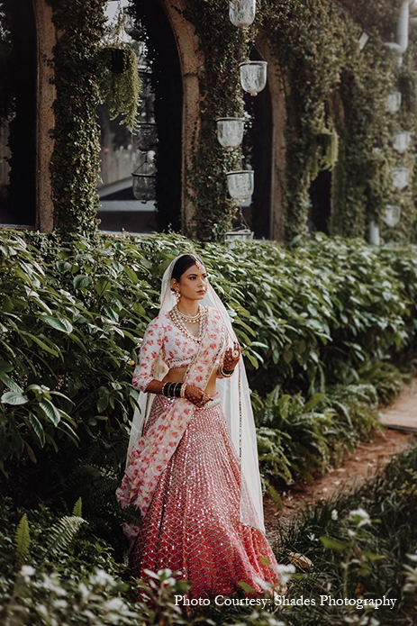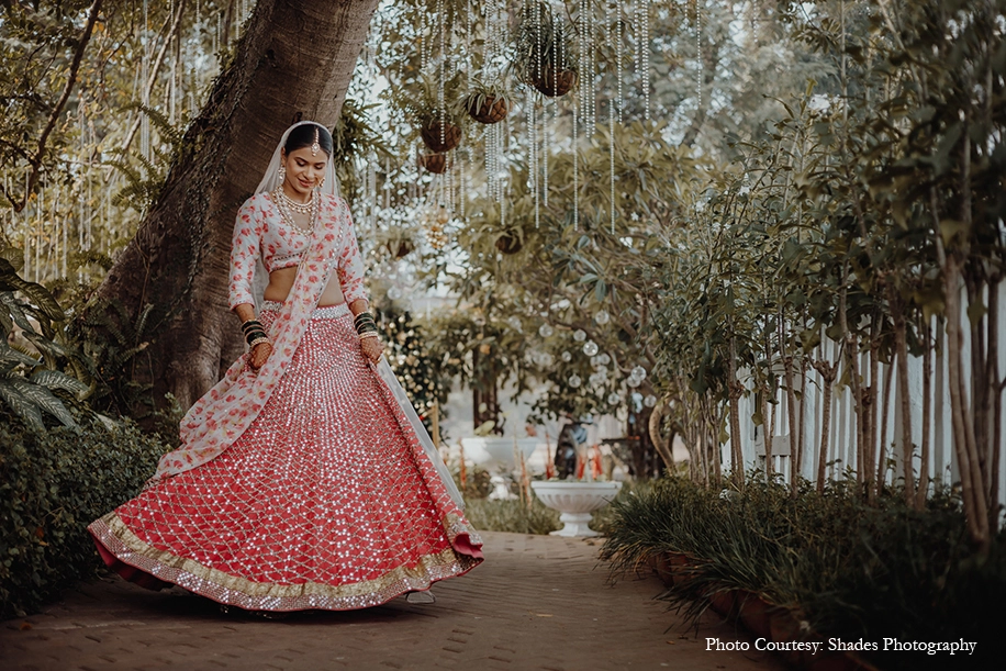 Describing her big day in detail, bride Tejal shares, “We followed a ‘Morning in a Vintage Garden’ theme, and the decor included blooms like peonies, roses, pink carnations, baby’s breath, wisterias along with foliage. Everything just came together seamlessly and the entire outdoor space exuded whimsical vibes. Considering it would be sunny by the time the phere began, each guest’s round table was sheltered with an umbrella that was decorated with real roots of Banyan trees and dainty florals that were in sync with the mandap. The mandap was clad with florals in pink, white, blush pink, powder pink and peach along with a plethora of foliage-based accents. The mandap itself had a glass bottom with pale pink roses strewn beneath the panel. To welcome the guests, the entrance pathway was a dreamy sight with hundreds of white suspended wisterias that swayed with the breeze all day.