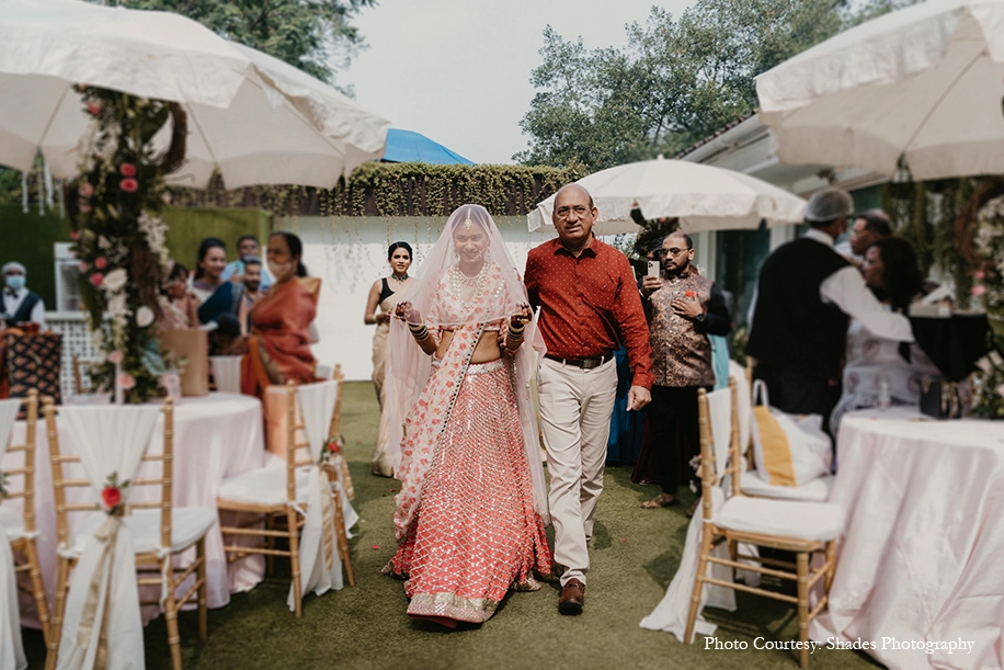 For their December wedding, the couple zeroed in on reliable vendors who would make their dream wedding come to life. Tejal shares, “The pandemic disrupted our plans twice and we postponed our wedding to the end of 2021 in December. However, everything turned out just beautifully as we had some amazing vendors on our wedding squad.” The decor spearheaded by Dream Designs by Roxana Buhariwala looked out of this world. Bride Tejal shares, “From the day I first met team Dream Designs, I just knew that my dream wedding decor will turn out just like how I had envisioned it! With a ‘Morning in a Vintage Garden’ theme, the decor brimmed with dainty florals and foliage. Keeping the sunny weather in mind, the decor team also equipped each guest table with cheery umbrellas. Every detail was looked into thoroughly so I could easily enjoy my big day to the fullest! We also made Kelvin’s late father part of the ceremony whereby the team customized a floral-laden Chiavari chair to hold his father’s photo as we took the vows. Thank you so much Dream Designs for accommodating my custom requests and making our day super special.” Adding to the team was Shades Photography who gave Tejal and Kelvin a treasure trove of memories. She shares, “I have always adored the aesthetics of Shades Photography and their careful editing process. Their team did a great job in capturing intimate moments at the ceremony and made it all so seamless. The photos do the talking and I can’t help but browse through them once every few days.”