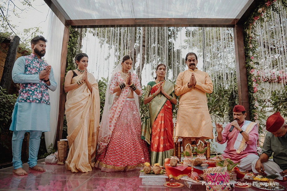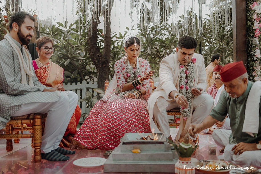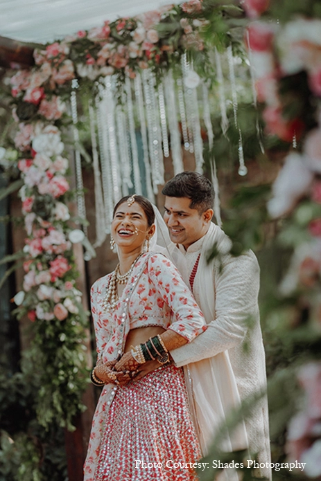 As the guests walked in, they were welcomed with a breath of fresh air and a beautiful view of the Mahalaxmi Racecourse. Since it was an intimate wedding, we hosted just one function which was the main wedding. Keeping in mind the time of the day and everyone’s food preferences we chose a customized spread.” The wedding was also a heartwarming fusion of three different cultures as Tejal goes on to explain, “The Wedding was held as per Maharashtrian traditions with a contemporary touch. Kelvin is a Sindhi-Catholic, hence I fused in Catholic traditions by walking down the aisle with a five-meter-long tulle veil that I had customized for myself and held by my bridesmaids as I walked down the aisle to a romantic tune. I fused Sindhi elements in the wedding ensemble by wearing layered kundan necklaces instead of the traditional Maharashtrian gold necklaces, and a round nathni instead of a Maharashtrian nath. I wore a custom-made minimalistic crystal mundavlya to infuse the Maharashtrian tradition in the ceremony.” Describing her outfit, she adds, “Bougainvilleas are one of my favorite flowers and the moment I saw Abhinav Mishra’s hot pink lehenga from his Sahiba collection, I just knew I had to make it mine! The delicate way in which the bougainvilleas spread across its stunning backless choli, complete with the most gorgeous mirror latkans had my heart. The hot pink lehenga, however, was the highlight! Filled with the designer’s cascading mirrorwork paired with a bougainvillea print organza dupatta.”