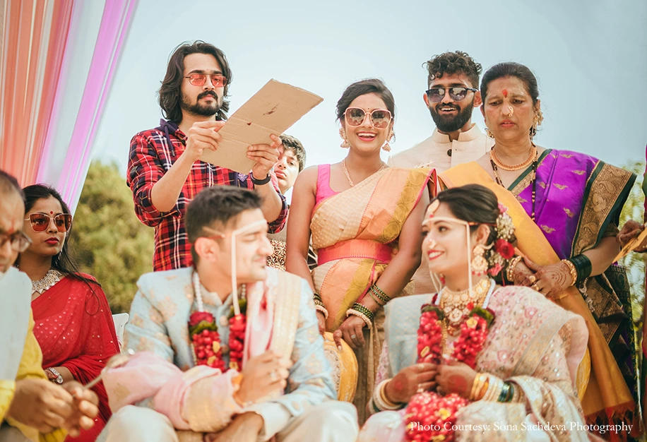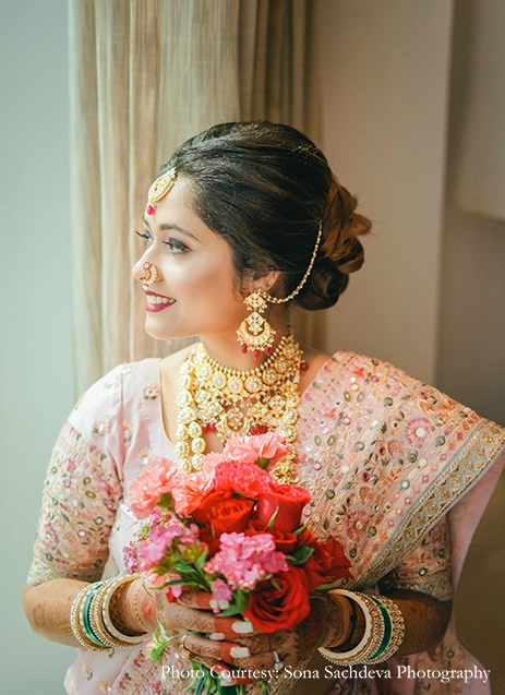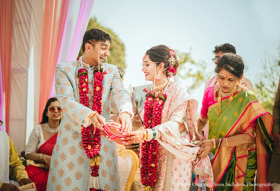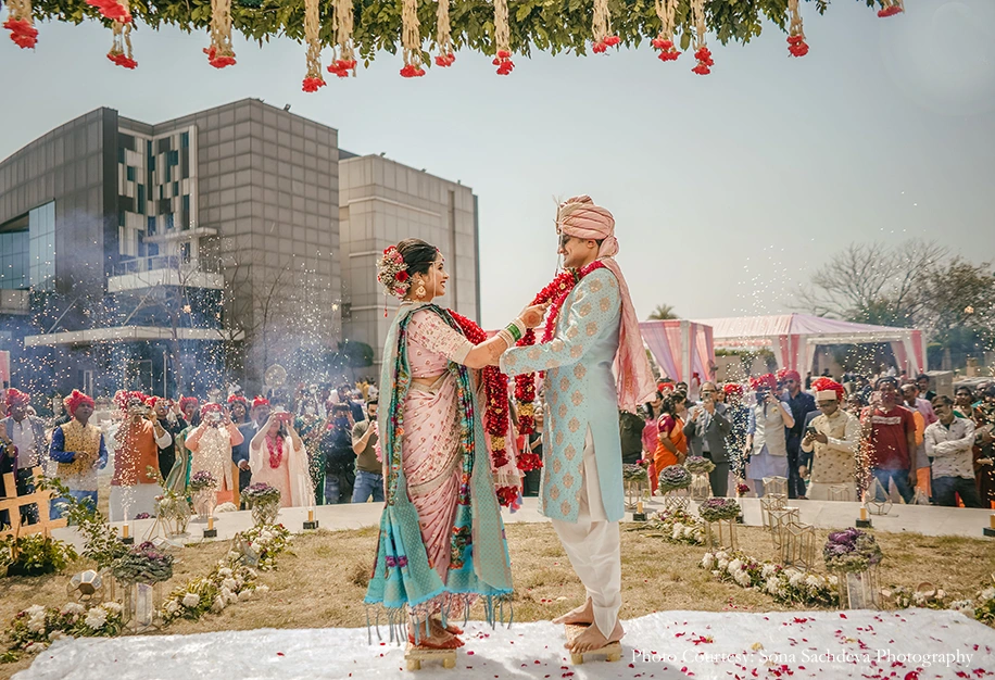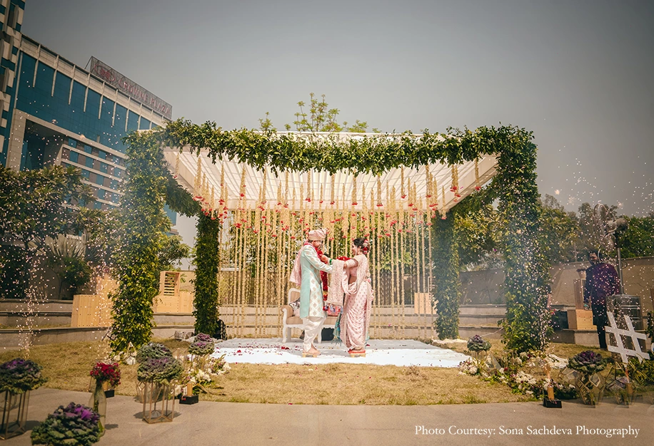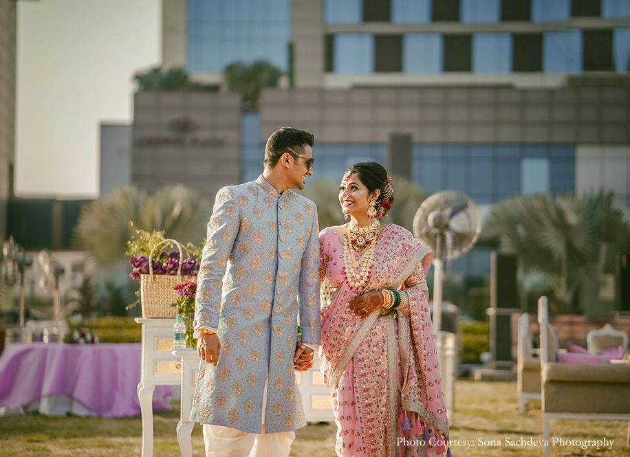 The Wedding was an enchanting affair hosted in the lush outdoor space of the property. Pastel decor in dreamy shades of pink and lavender adorned the verdant green space. Striking floral arrangements and delicate metallic votives, lanterns and other props made for a lovely contrast. The stunning mandap was designed with leafy green columns, a floral canopy and flowing drapes that painted a beautiful picture against the grand structure of the hotel beyond. The couple sported gorgeous coordinated baby pink and blue attire designed by the bride herself for the traditional Marathi nuptials.