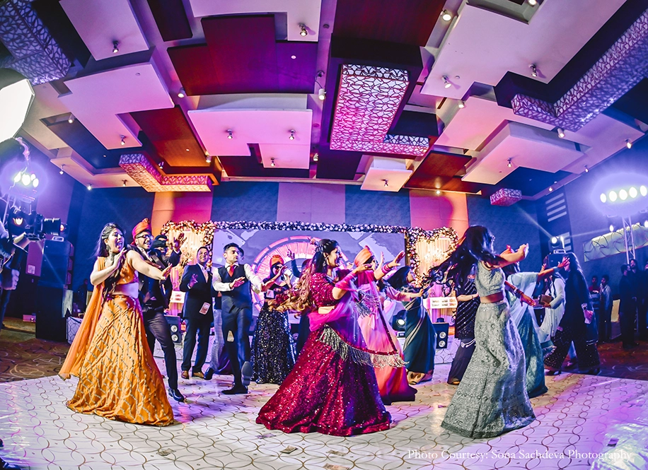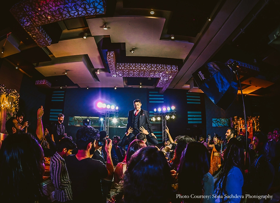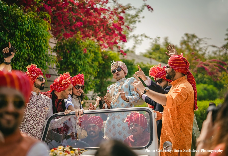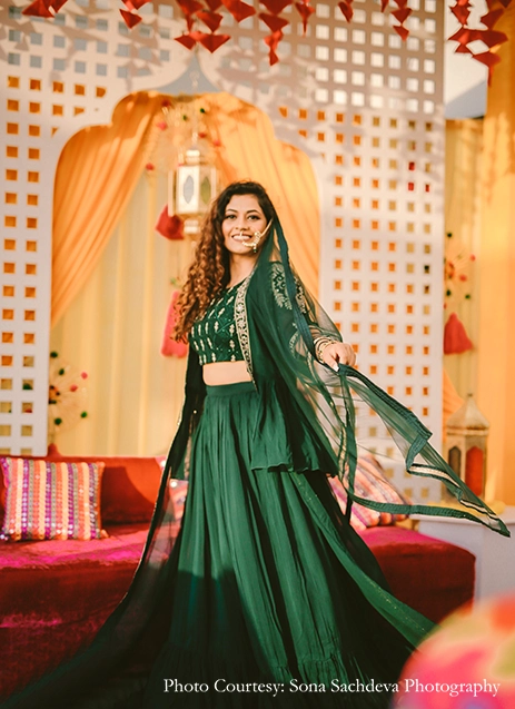 The festivities kicked off with a vibrant yet laidback poolside Mehndi function. Colorful decor in hues of pink and orange set a lively bohemian tone for the occasion, while elements such as intricate walls, drapes, antique lamps and more, added a mystical Arabian twist to the ambience. The bride gave the tradition of wearing green a unique edge with an indo-western jacket lehenga, fierce open curls and bold jewellery. The groom duly complemented her by pairing his cream kurta with an embroidered green jacket.