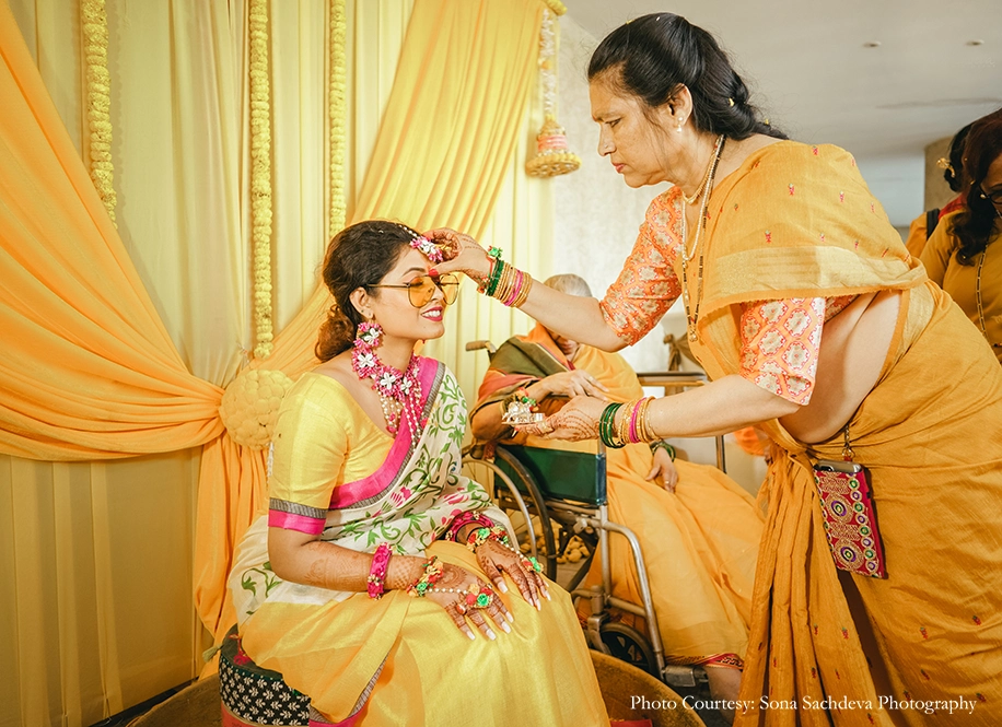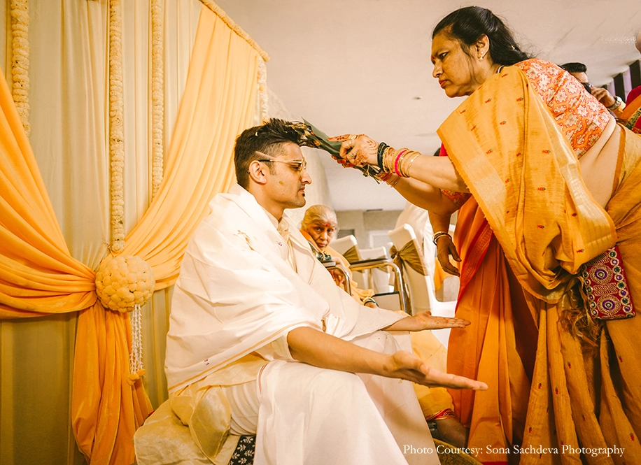 The Haldi function was a warm traditional ceremony with a customary decor of yellow drapes and marigolds that added to the tranquil feel of the ritual. The bride and groom smiled happily as their loved ones smeared them with turmeric paste.