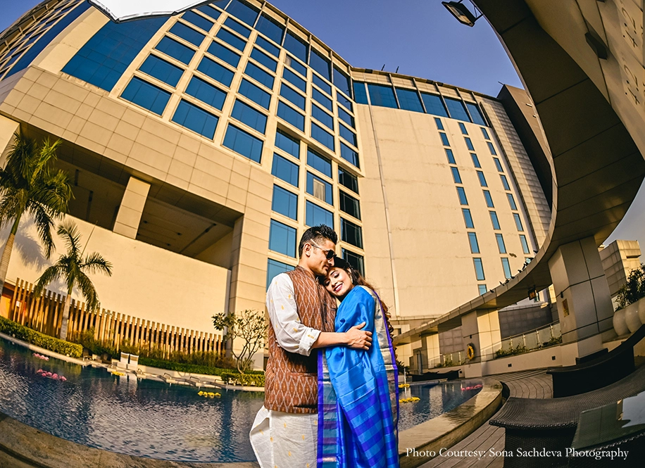 With the bride being based out of Delhi, the couple was on the search for a versatile, gorgeous venue with a variety of indoor and outdoor venue options for their intimate wedding, and they found their dream location at Crowne Plaza Greater Noida. Conveniently located, the sprawling venue combined striking spaces both indoors and out, with impeccable hospitality for a memorable experience. The engagement was hosted in the ballroom space of the property while the daytime pre-wedding festivities were by the poolside. The wedding with its plush decor was held outdoors.
