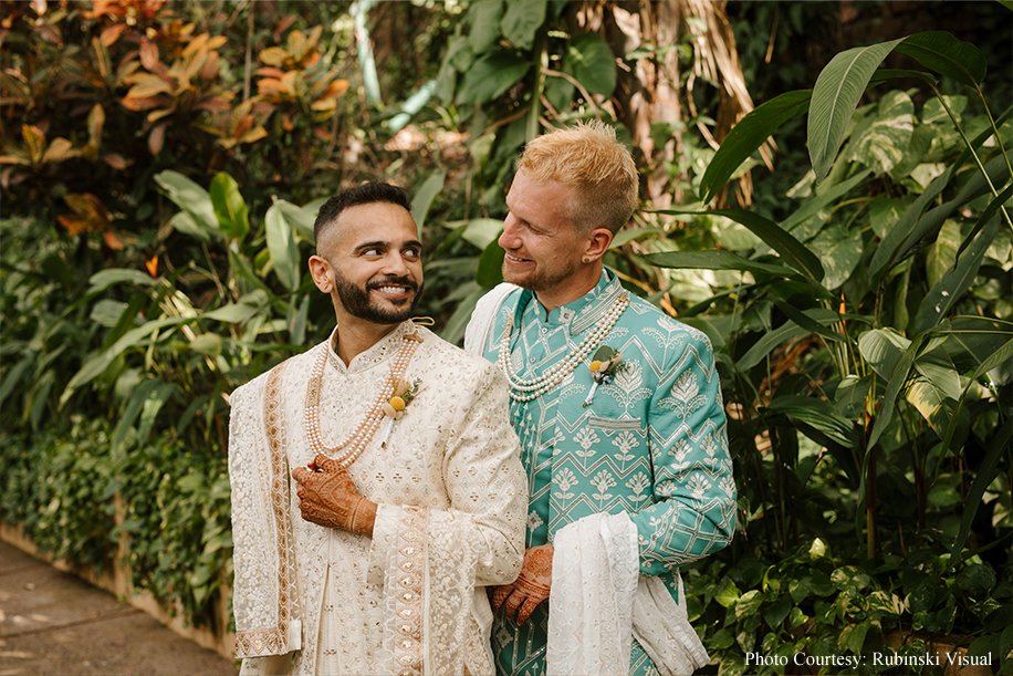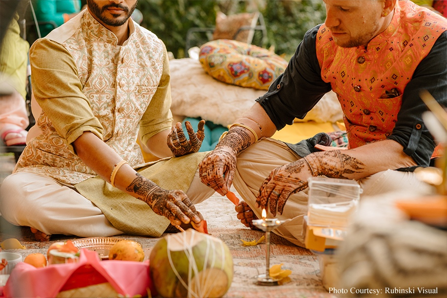 The celebrations commenced with a lively mehndi and sangeet. A canopy created out of garlands of marigold blooms sheltered the guests as Ansh and Troy got their hands patterned with henna. With a global guest list, the international attendees were quite fascinated with the henna patterns on their palms. Ansh’s family also hosted pre-wedding puja rituals. Once, the henna was dry, it was time for the sangeet. As dusk fell, the wedding party geared up to take the stage by storm with some epic performances!