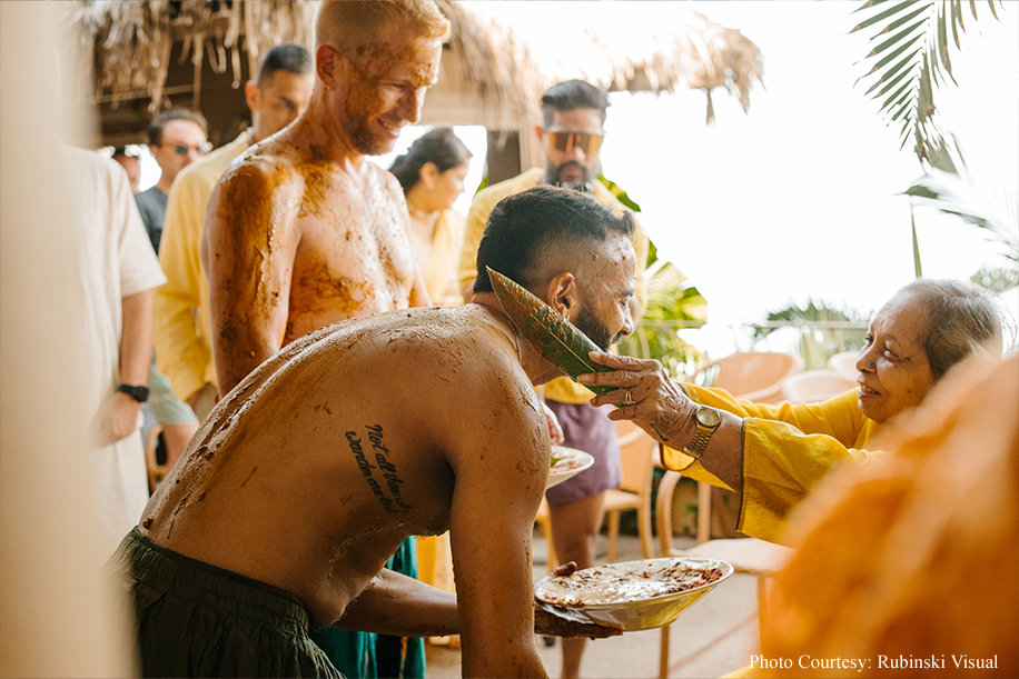 Next in line was the haldi ceremony and the guests colour-coordinated their outfits in bright yellow hues. Surrounded by tropical palms, straw-thatched roof gazebos and whimsical decor elements, the to-be-weds were at their cheerful best as their loved ones slathered them with turmeric. With the seashore close by, the couple then frolicked in the waves to wash off the turmeric mixture.