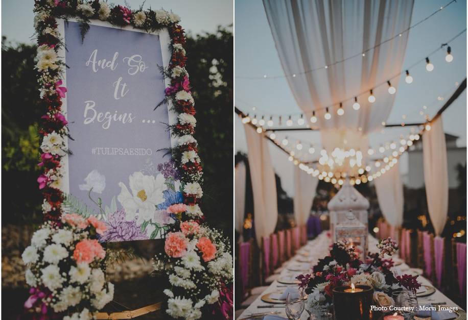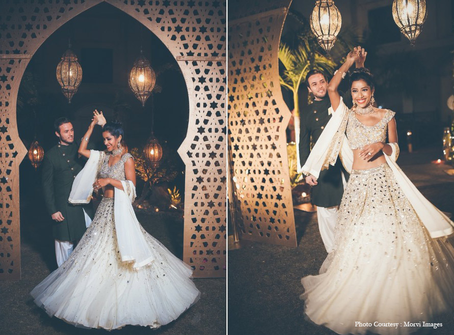 We had a sit-down dinner for close family and friends. We’d envisioned modern Sufi décor. I really wanted a lavender, lilac touch to go with our outfits. RashiNidhi did an amazing job bringing that vision to life. The soft hues with beautiful flowers and Moroccan lamps looked gorgeous. To match the mood, I wore a white lehenga by Nadine Dhody and Filip wore an Indo-Western outfit by Dhruv Vaish.