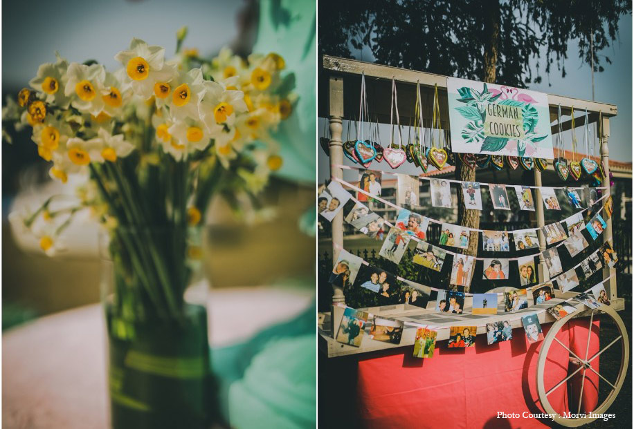 The decor brief for this function was to create a tropical mela; so we had a mash-up of flamingos, pineapples, fresh blooms, along with bright buntings and Rajasthani mirror work. (We also had some traditional German cookies on a thela.)