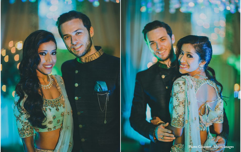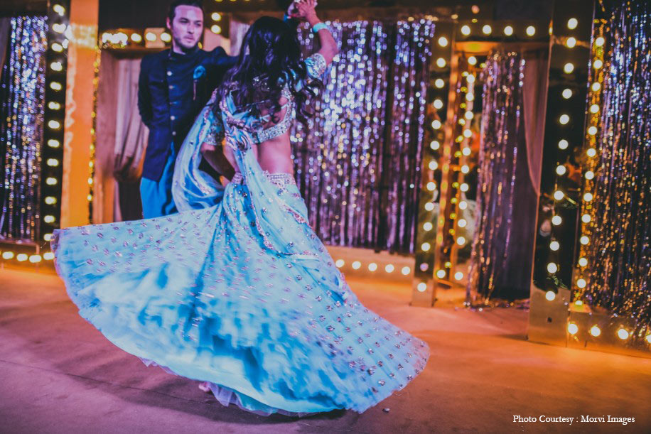 The setup for our sangeet was in blue and silver. The entrance was bathed in blue light and shimmering elements were included at our photo-booth as well as the stage. To go with the mood, I picked light blue lehenga by Mrunalini Rao.