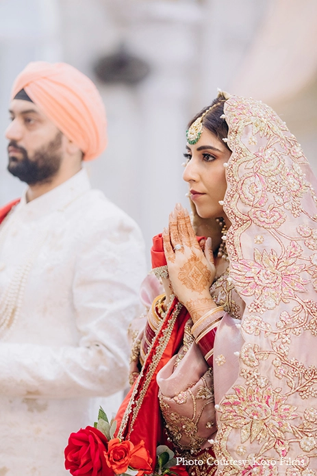 The Anand Karaj saw whimsical decor of spring blooms that beautifully decorated the Bangkok Gurudwara. The Sikh ceremony was followed by the Hindu traditions of Jaimala, Sindoor, and Mangalsutra. The groom opted for an elegant blush pink sherwani, which the bride complemented in an unusual ‘Tradition meets modern pastels’ ensemble of blush pink and red. Twinkle shares, “Using my mom’s wedding dupatta as the palla in our phere made it all the more special. The fact that it had once been put by my grandmother on my mom’s head for her ceremony made me feel connected to them in my heart, and I would carry the memory of that with me forever.”