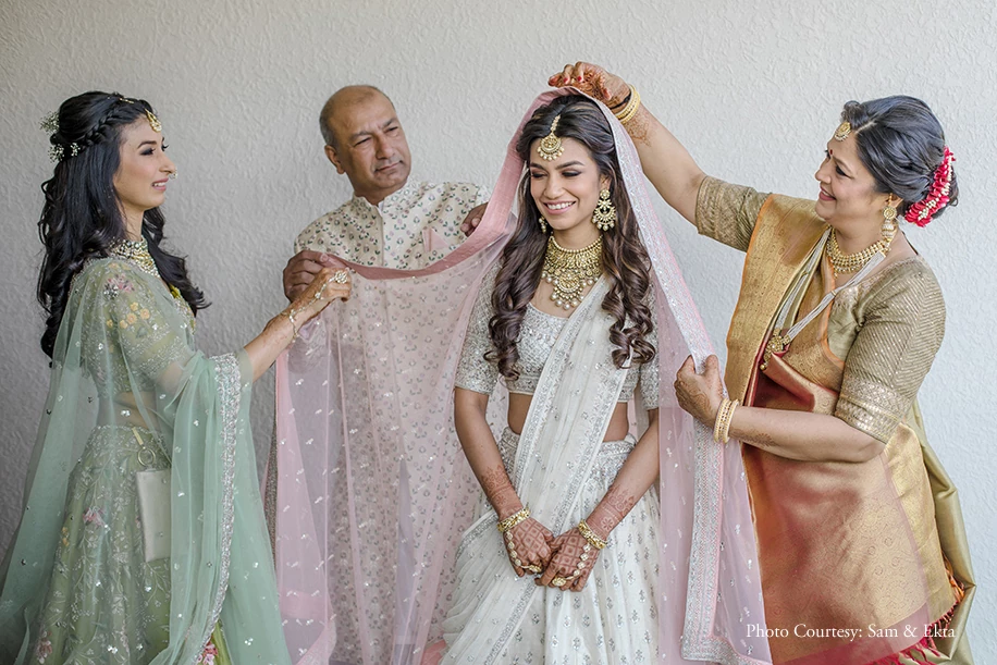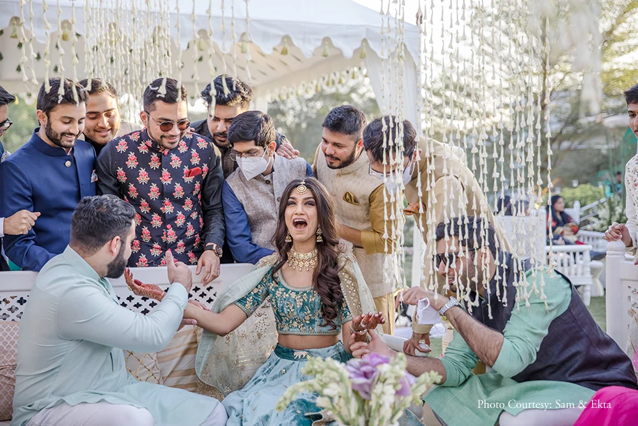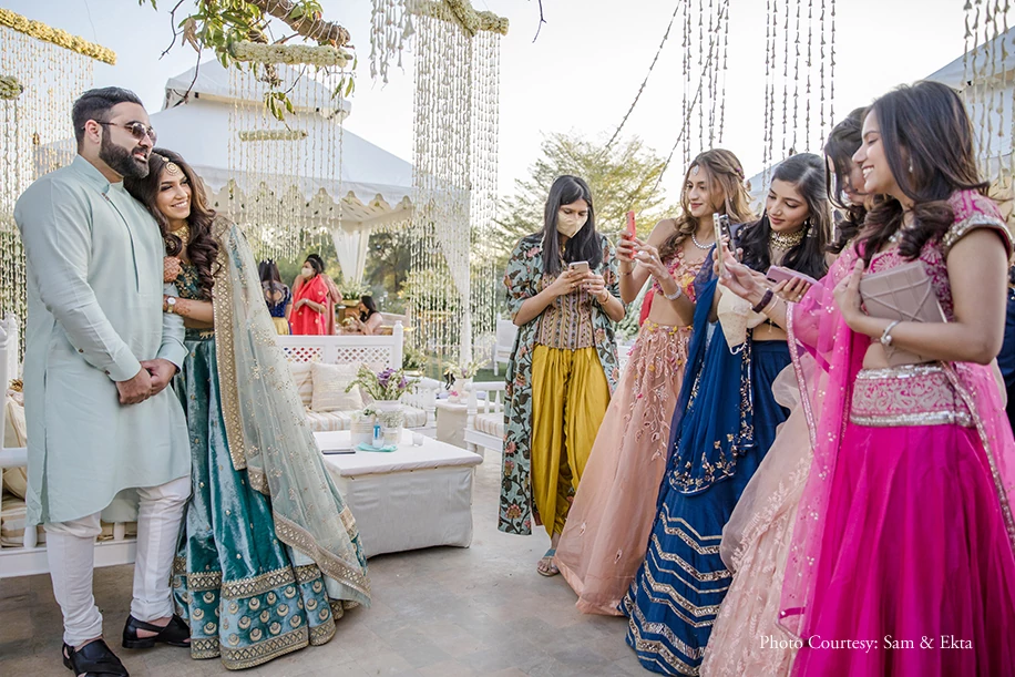 The celebrated team of Sam & Ekta was entrusted to capture their special moments. The bride shares, “Since I saw their work, I wanted them to shoot my wedding. Sam & Ekta were sweet, accommodating and exceptionally professional throughout, despite the changes in dates and venue. Our experience with them for our pre-wedding shoot was incredible, and we knew we had made the right call. They made us and our family so comfortable on camera, and they completely blended into our festivities like we had been friends all our lives. We highly recommend them.”