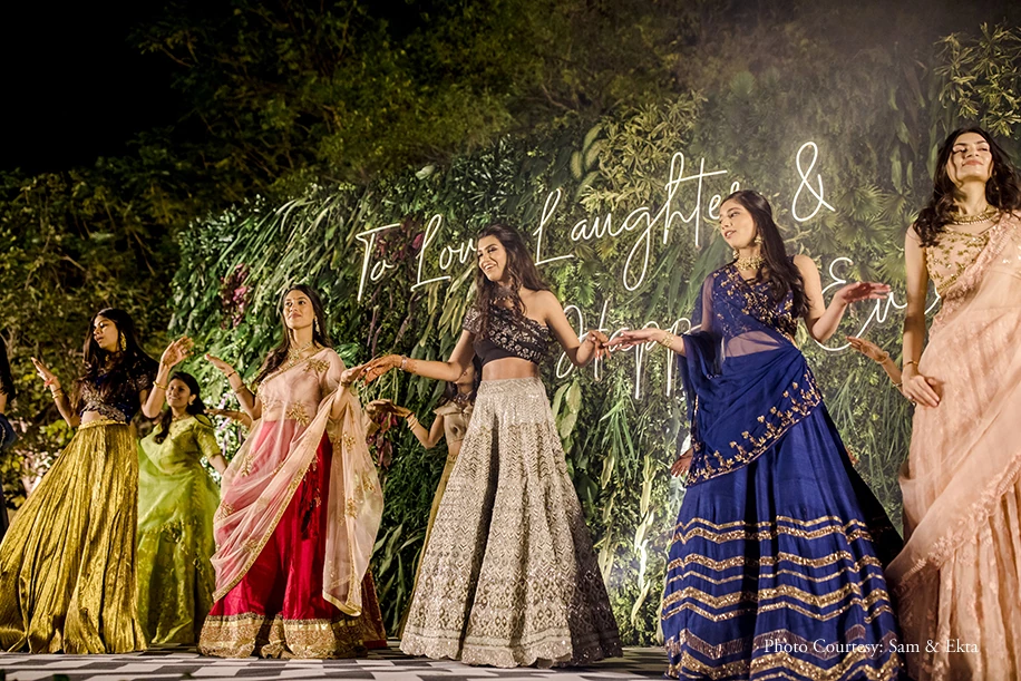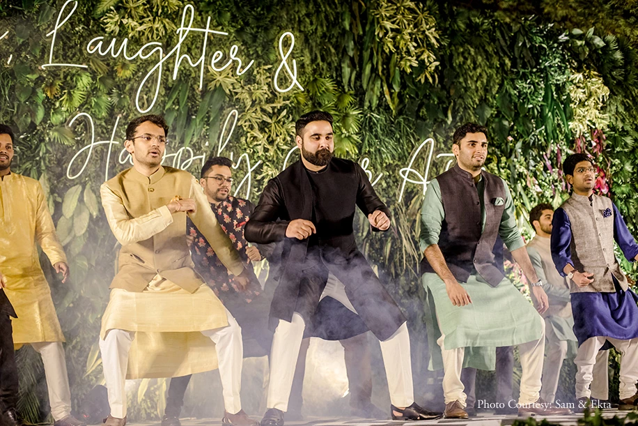 The Mehndi function extended into the Sangeet, and as the evening progressed, bright shimmering lights added some whimsy to the décor. There were LED Cabanas as well as a stage with a stunning foliage backdrop and LED lights, where the couple and their loved ones reveled to the music amidst several performances through the evening late into the night.
