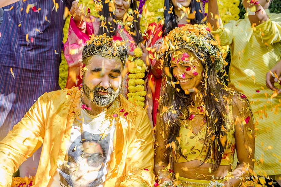 The sunny afternoon Haldi was a fun-filled event with grooving DJ music and a phoolon ki holi. The bride and groom donned quirky yellow outfits as they were covered with turmeric paste and showered with red rose petals and water amidst peals of laughter. Bright marigolds added some citrus magic to the green environs.