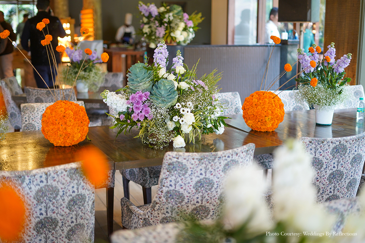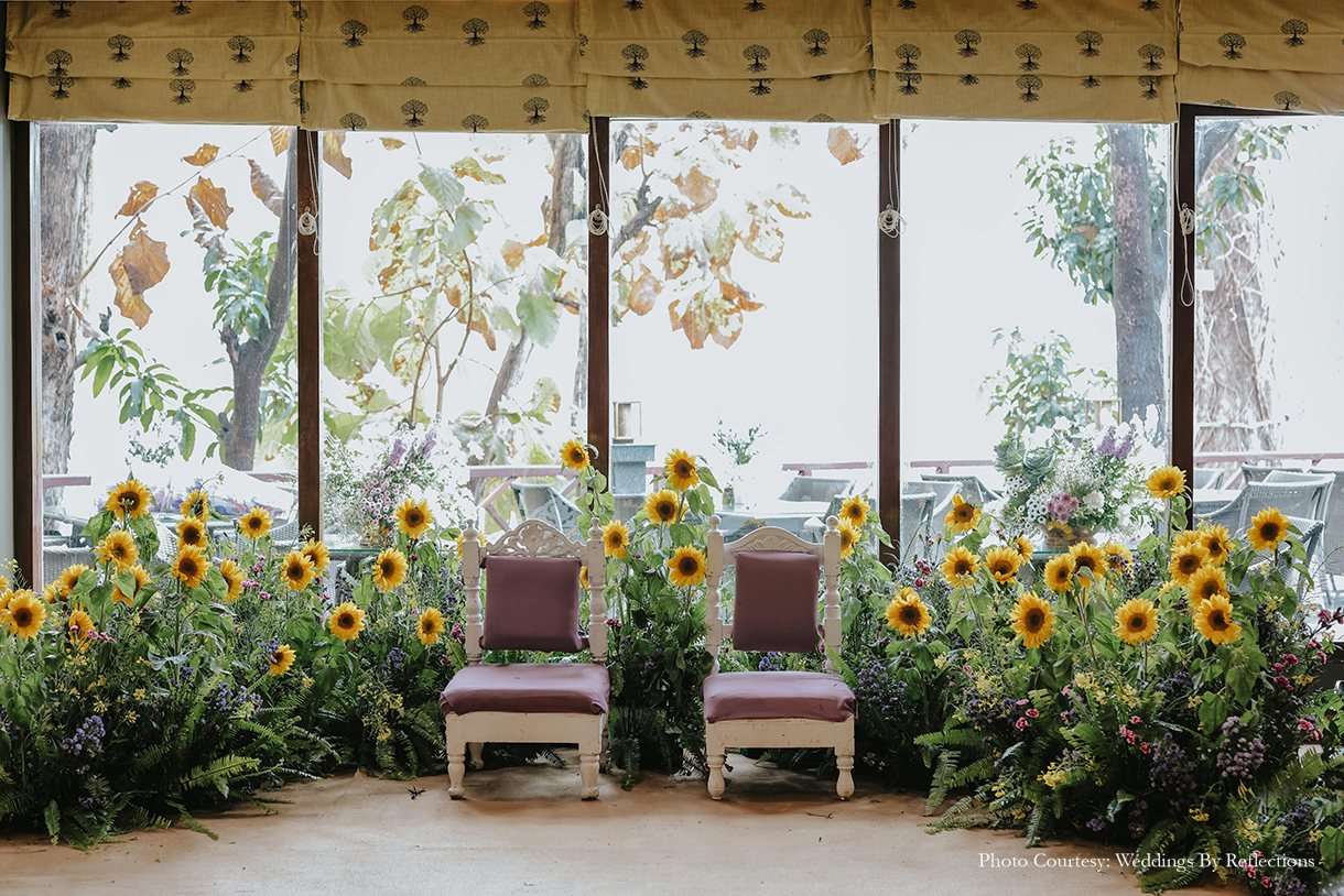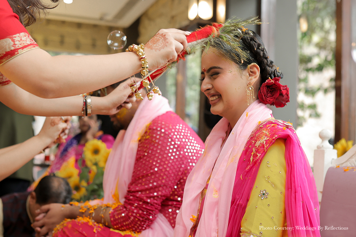 The next morning dawned with a lively Haldi ceremony that was held indoors. Fresh floral decor lit up the space in vibrant hues, with pops of marigolds adding a touch of tradition. Dressed in yellow and red, the couple looked radiant as they sat surrounded by a semicircle of sunflowers and wildflowers, waiting for their loved ones to anoint them with turmeric.