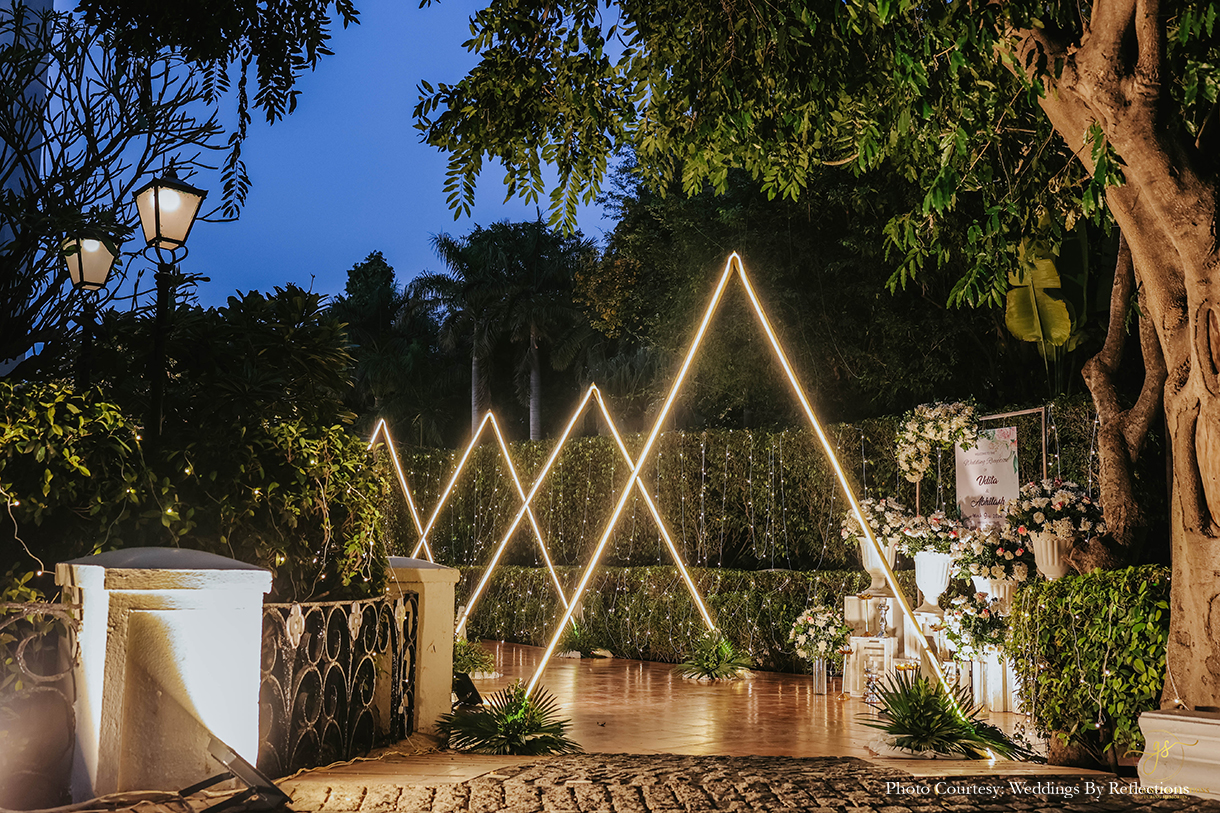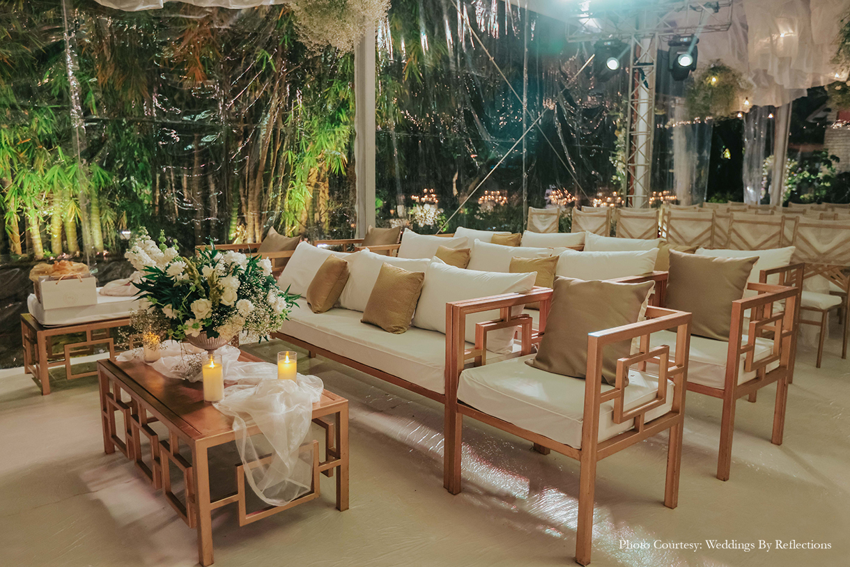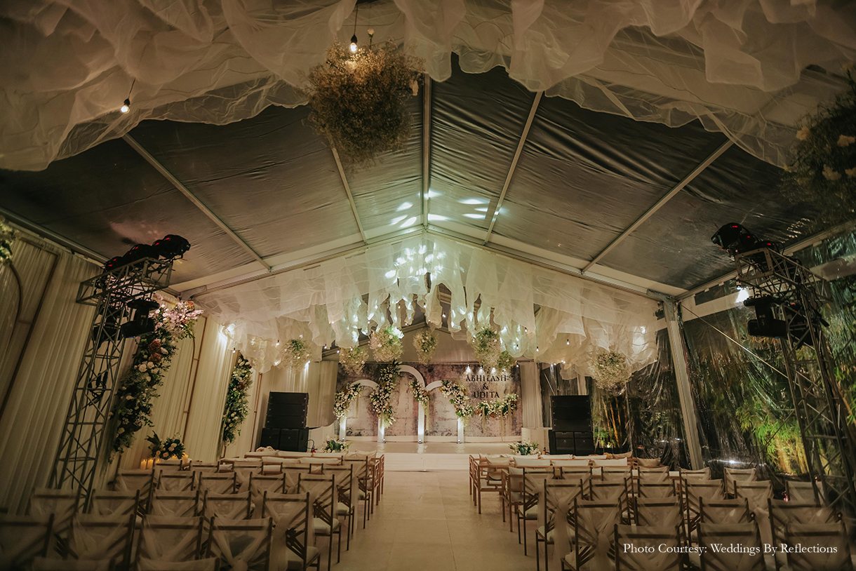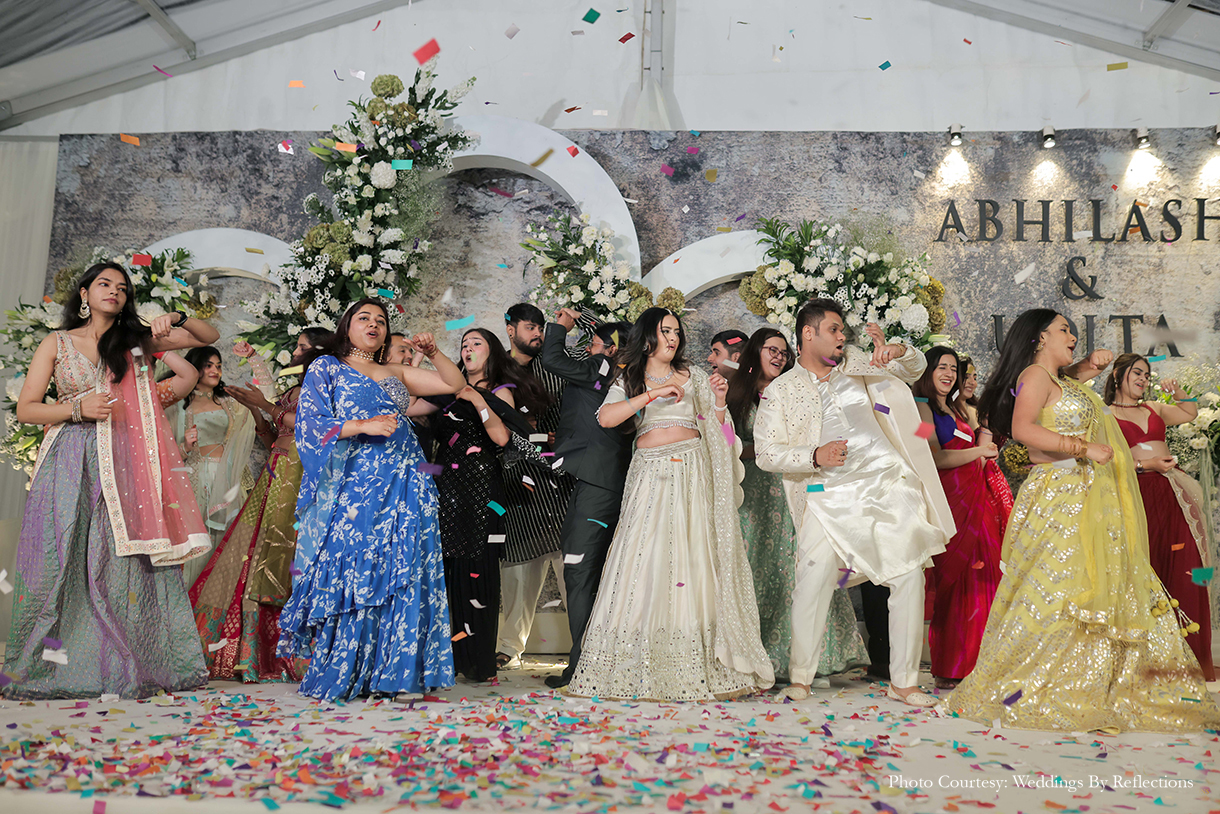 Imagined with dreamy white decor, the Sangeet night was planned around dance, music, cocktails, and unlimited enjoyment. The couple matched the vibe in stunning white mirror-work outfits by Abhinav Mishra. The night started with dance performances, after which everyone took to the dance floor and partied to their heart’s content.
