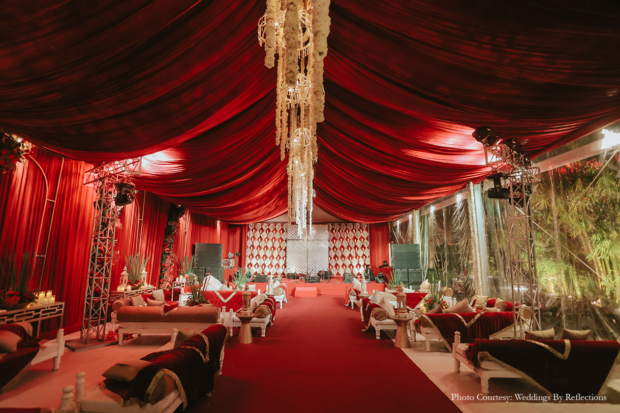 Udita shares, “There was rain, there was hail, but with the help of our loved ones and a team of great planners, everything unfolded perfectly, and it seemed as if the gods were blessing us on our big day!”. The wedding décor saw plush red drapes and furnishings, with gold accents and stunning flowers. The bride wore a traditional red bridal lehenga, but in her style, opting out of heavy accessories and leaving her tresses open for a more youthful, lighter look. The couple exchanged their vows in the presence of their friends and family and celebrated with some Sufi Music for a magical and memorable experience.