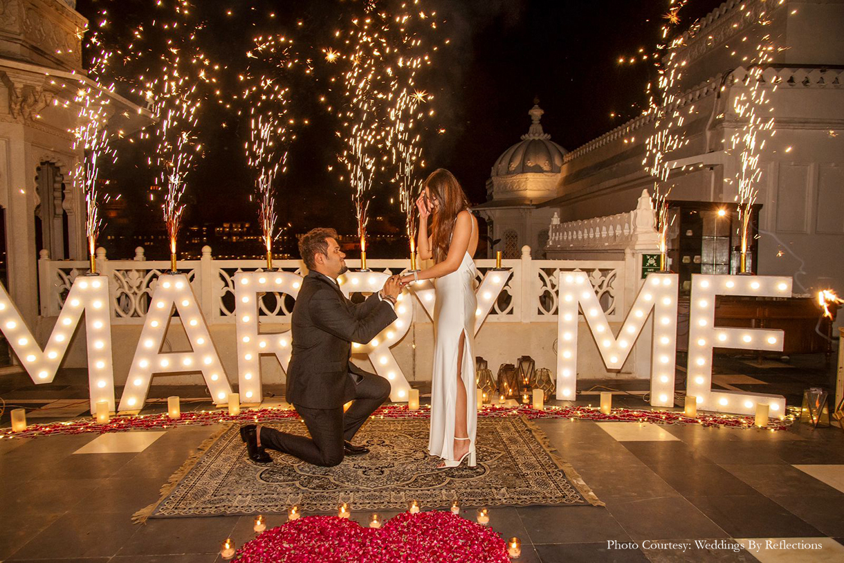 Udita shares, “We were already working together at the same law firm for a year before anything started between us. We clicked at an impromptu party and then there was no going back! After a week of spending time together Abhilash planned a dinner and asked me out in the most old-school way, and that’s when we started dating. Pretty soon we knew we had found the one, and after 2 months of dating we flew to Udaipur where, at the rooftop of Taj Lake Palace, Abhilash proposed in the dreamiest fashion, and we found our everything and beyond.”