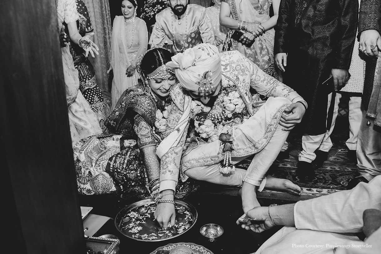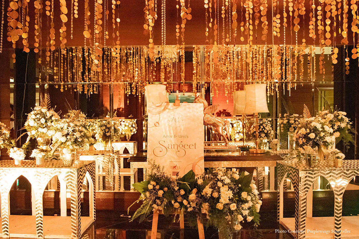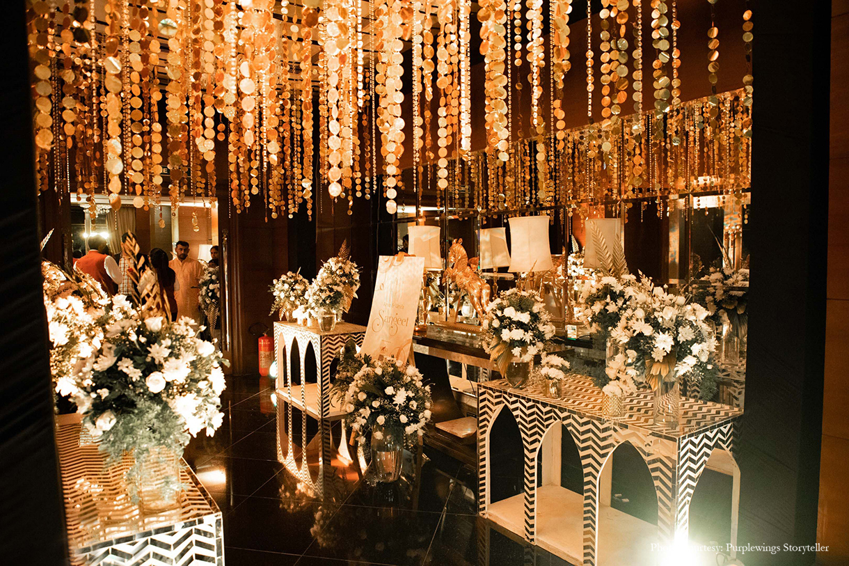 After the quiet Ganesh Staphna, the couple along with their families gave glamour a leg-up with a stunning sangeet. High on energy with live performances and graceful moves – the sangeet combined all things elegant and sophisticated in the decor. White blooms, sequins, gold cocktail glasses and a monochrome colour palette made it an event to remember.