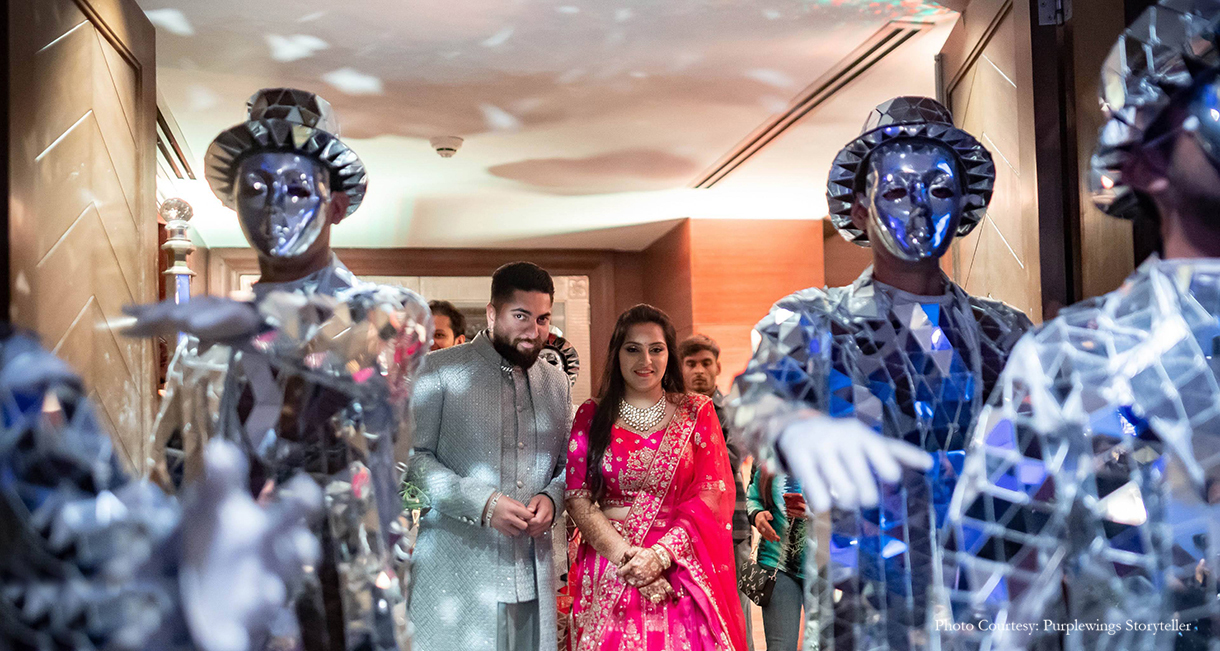 Birju shares, “The wedding mandap was nothing short of a piece of art! It was crafted with mirror work and included diyas. Larger-than-life installations added to the glamour while luxurious furnishings and crystal chandeliers enhanced the opulence of the wedding. In short, it was a perfect combo of traditional and modern designs.”