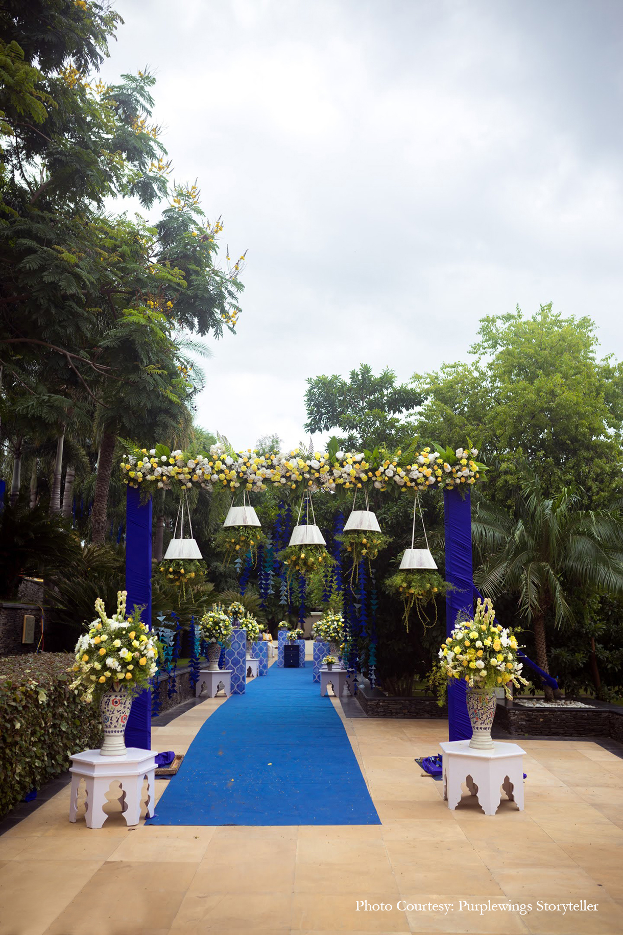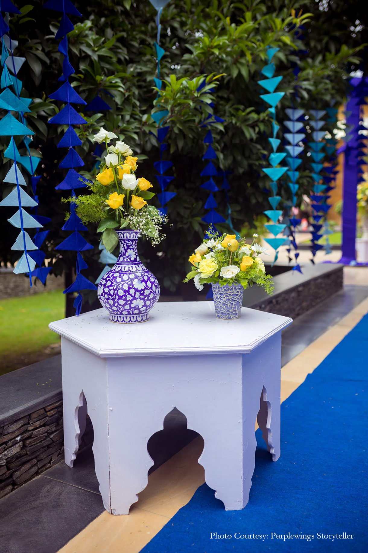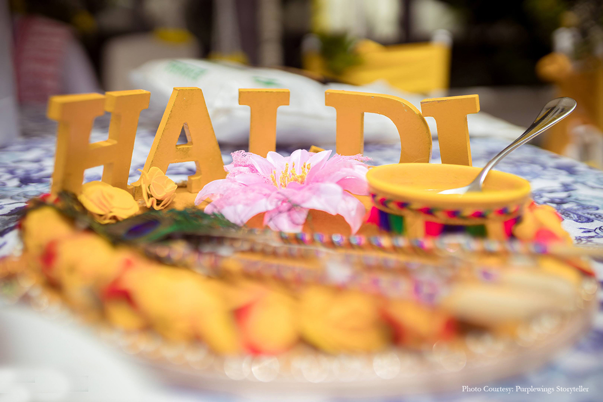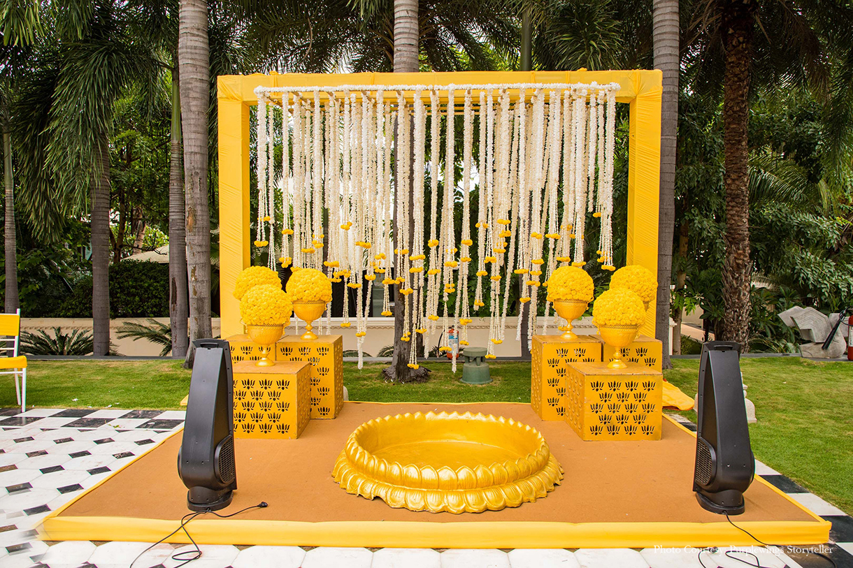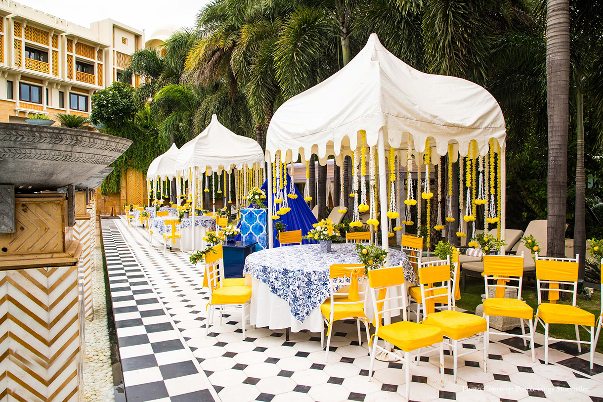 Sunaina shares, “Since we were in Rajasthan, we took a cue from its local art and added a dash of blue to the yellow floral decor. Hosted by the pool, the blue and yellow decor complemented the venue and looked unique!”