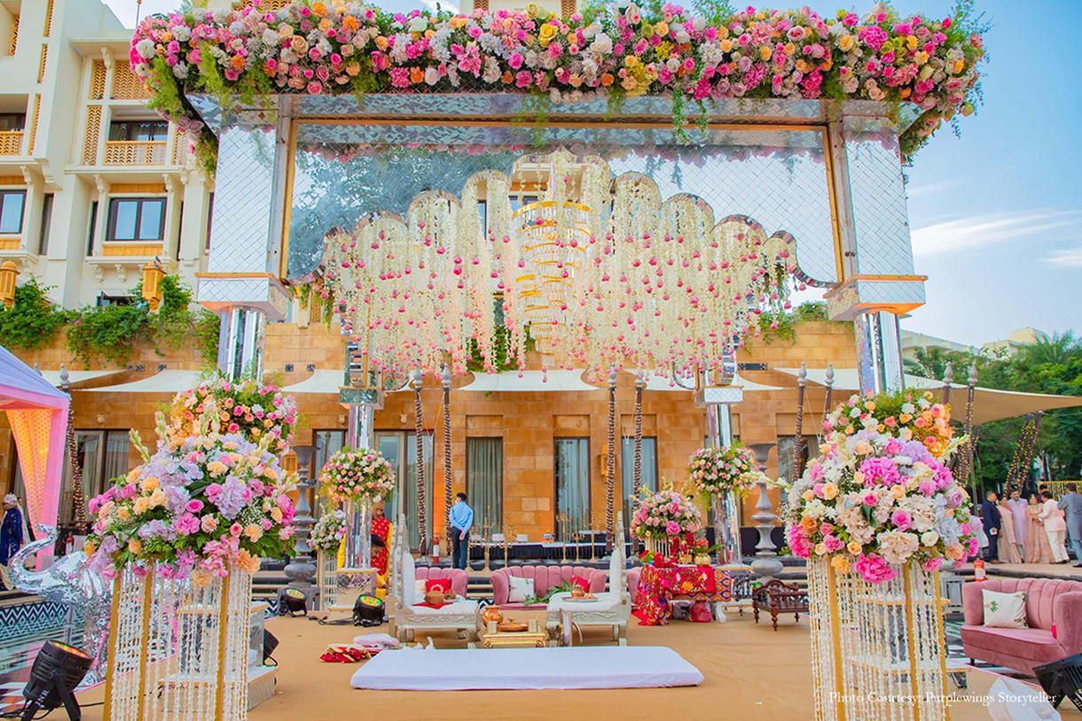 An elegant sangeet, a mirror work wedding mandap and a blue pottery-inspired Haldi - this destination wedding pulled all the stops with its design themes.
