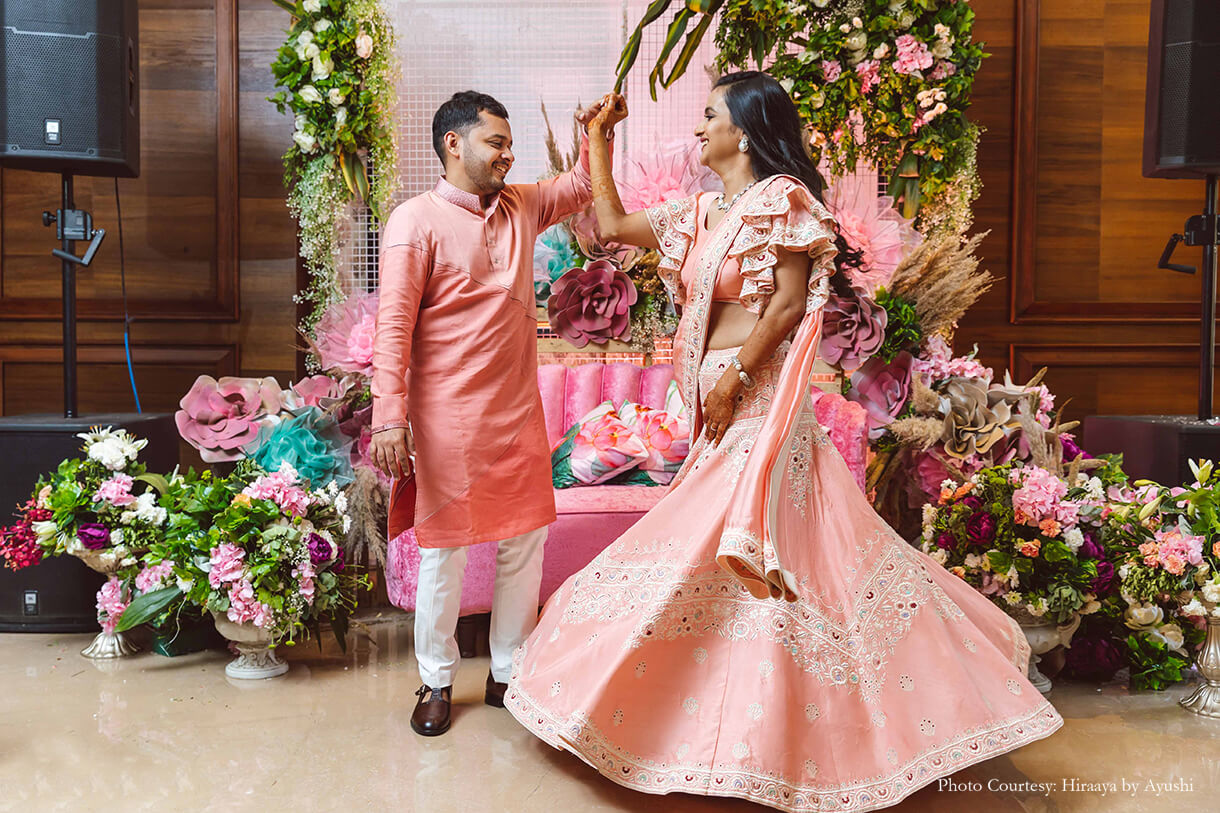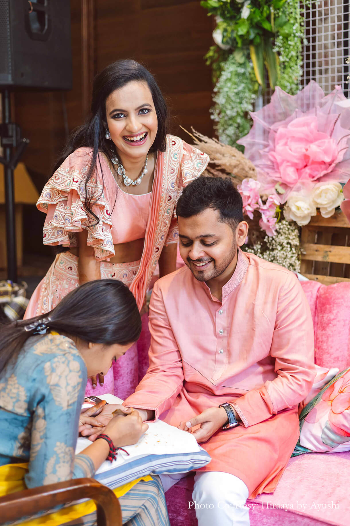Adorned with pink blooms that were accentuated by turquoise elements, the mehndi exuded playful vibes. With a special seating area crafted for the couple with a comfy rose-hued soda and a matching backdrop, the to-be-weds had a gala time as everyone around them got henna patterned on their palms.