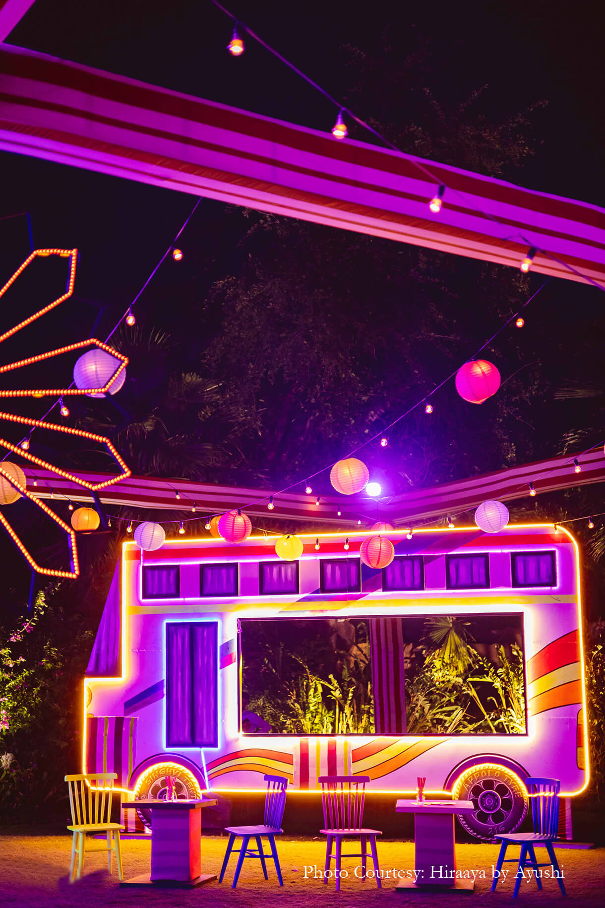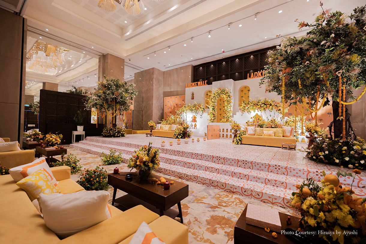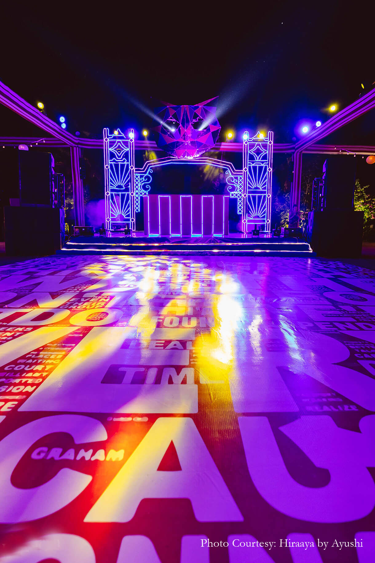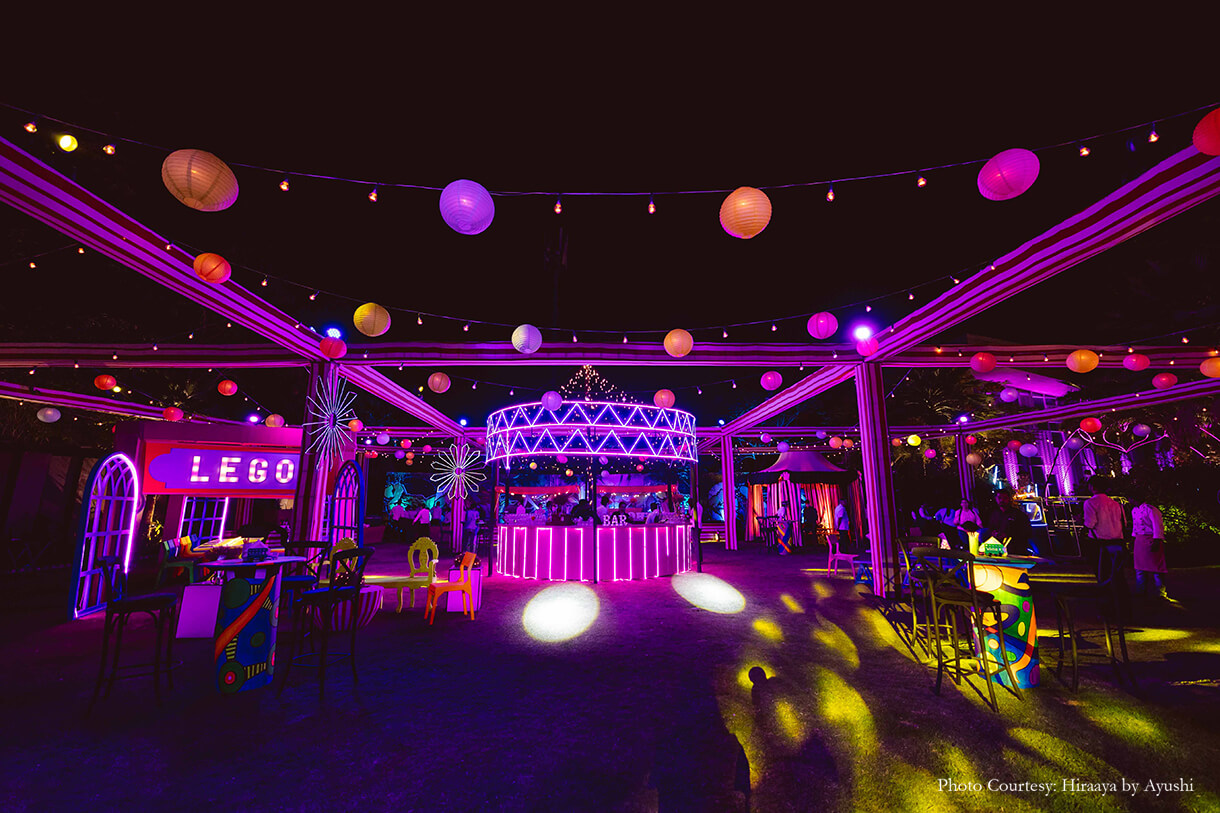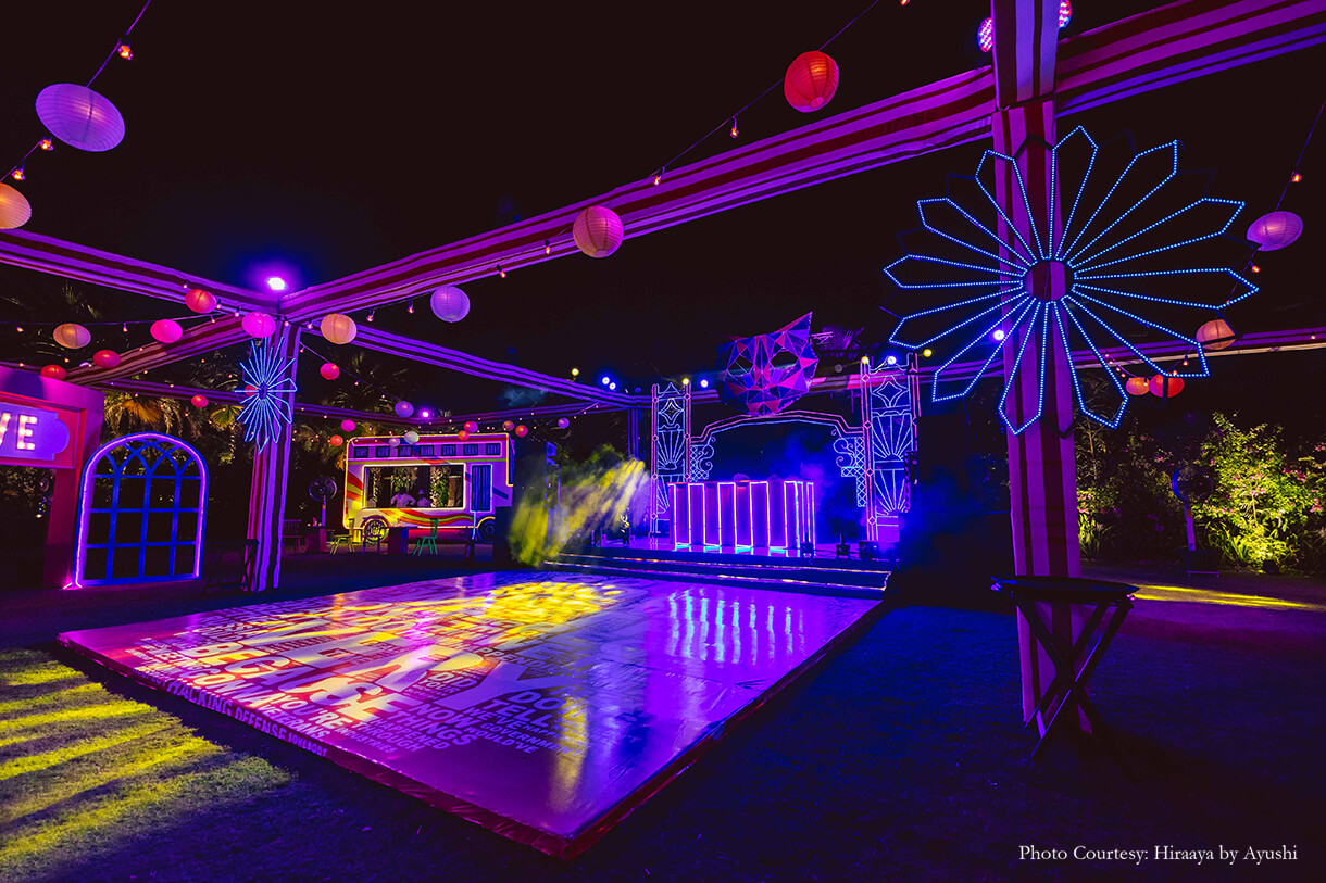 Flaunting LED lights and quirky decor elements, the Youngster Party amped up the glamour levels. Hosted at the second Mewar Lawn, this party had everyone in high spirits with its carnival-like atmosphere which included entertainers dressed as robots. A typographic dance floor and round lanterns only added to the fun!
