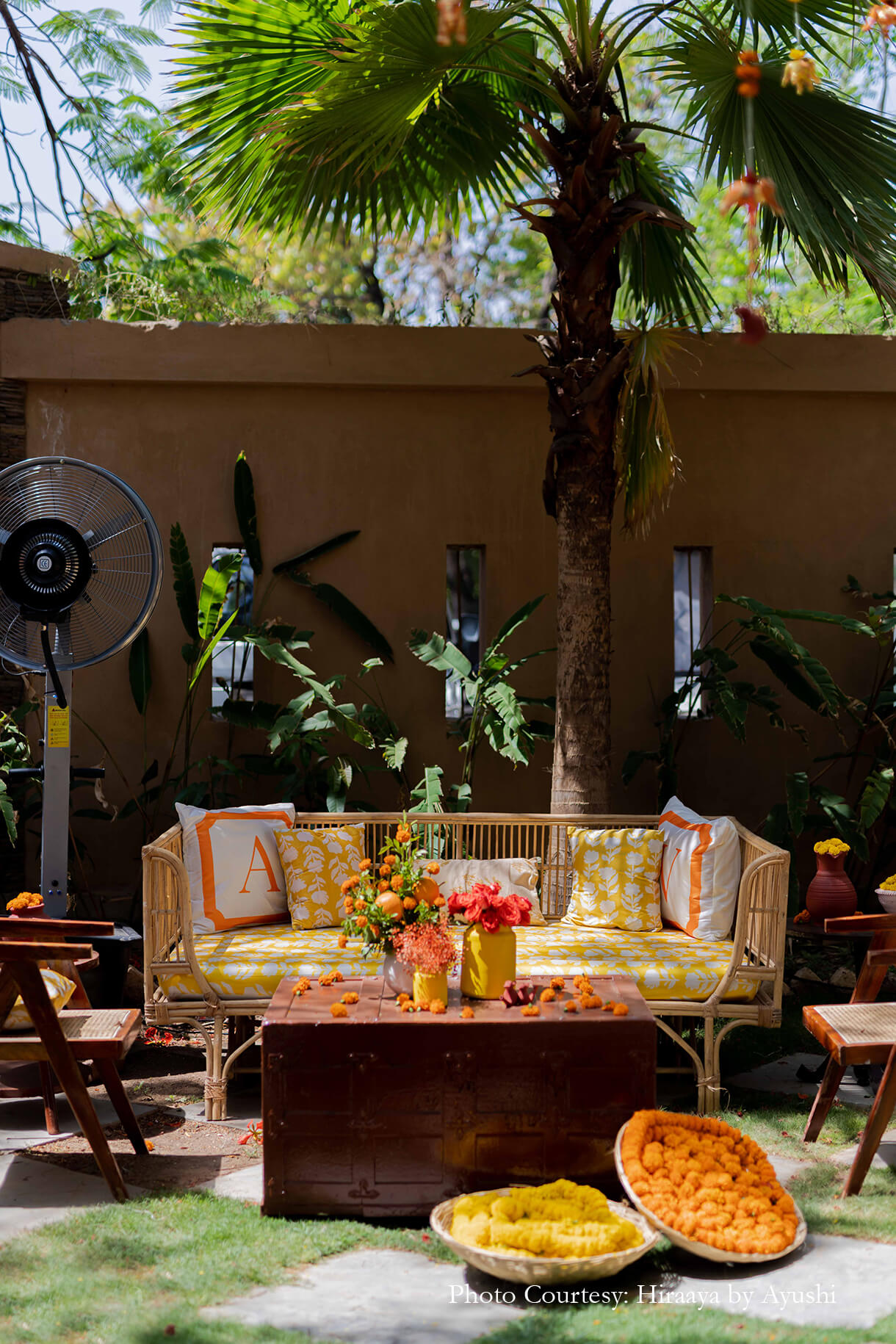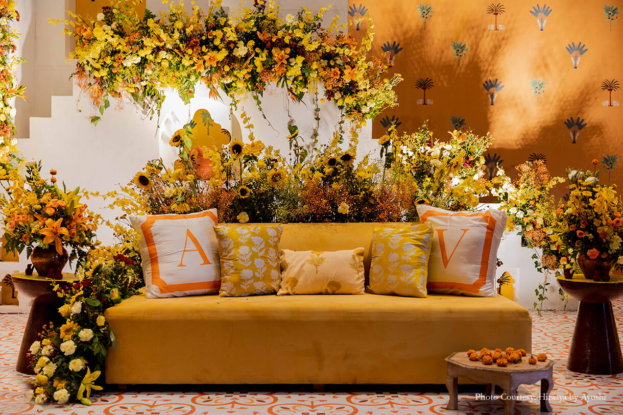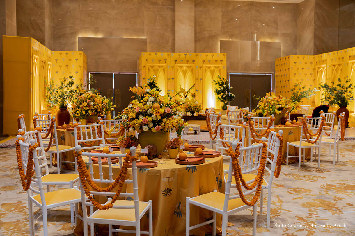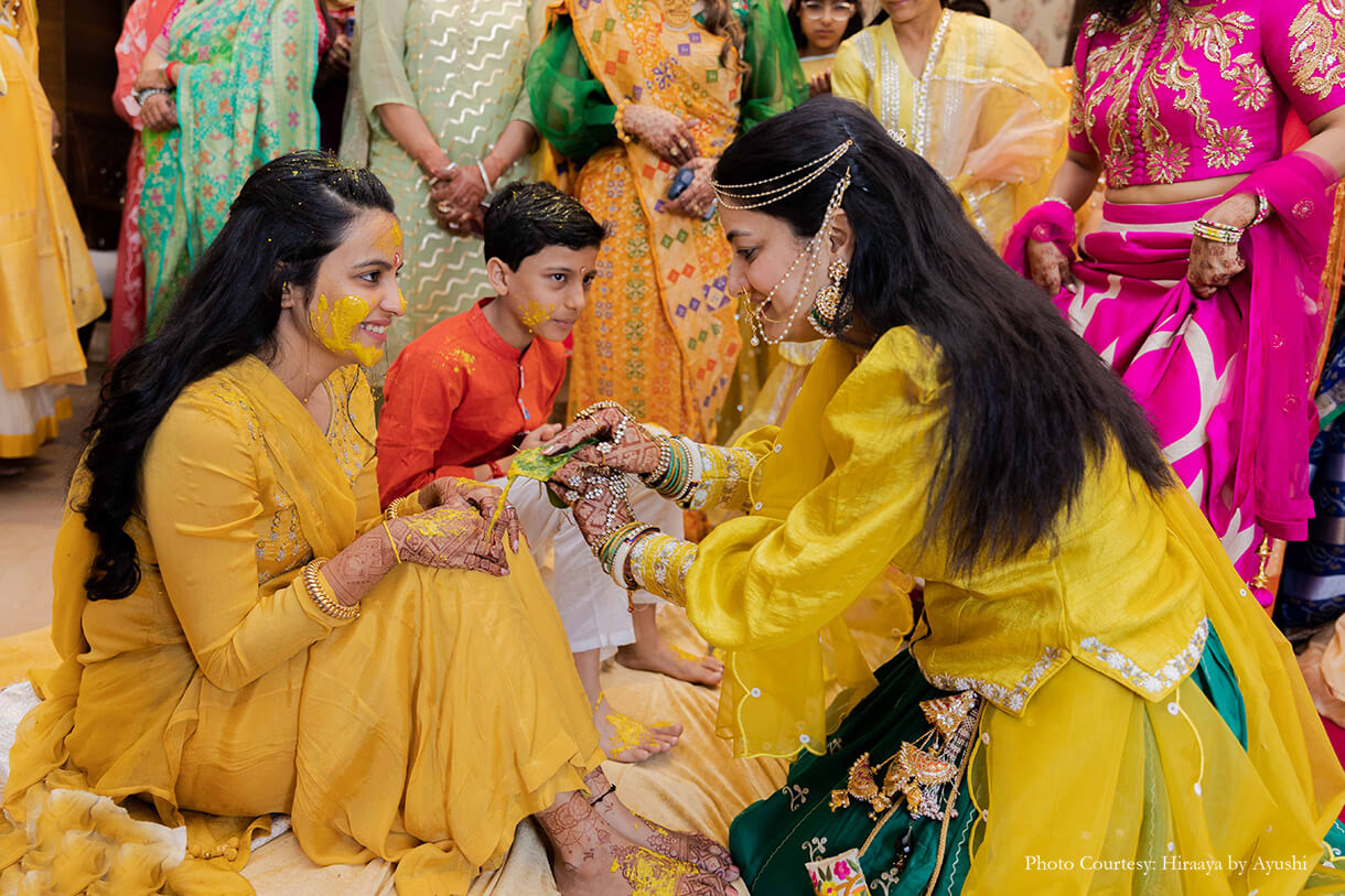 Surrounded by her closest family and friends, Vaidehi combined the celebration of her haldi and myra within a day. While the haldi was hosted indoors and consisted of several playful moments, the myra was hosted under the blazing sun and surrounded by the beauty of the mountains.
