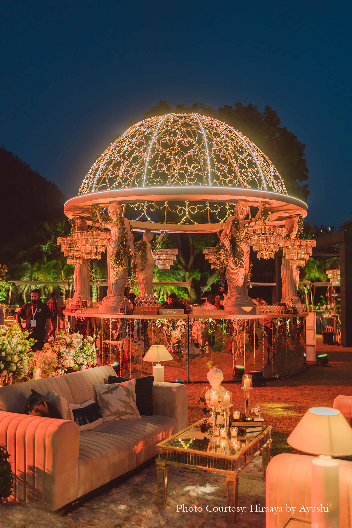Flaunting soft glam decor and held at the vast Mewar Lawn, the event was a breezy one lit up by gold lights that gave the proceedings a cosy vibe. Following ‘The Glam Forest’ theme the event included lit-up gazebos, huge chandeliers and Grecian-style statues as decor elements.