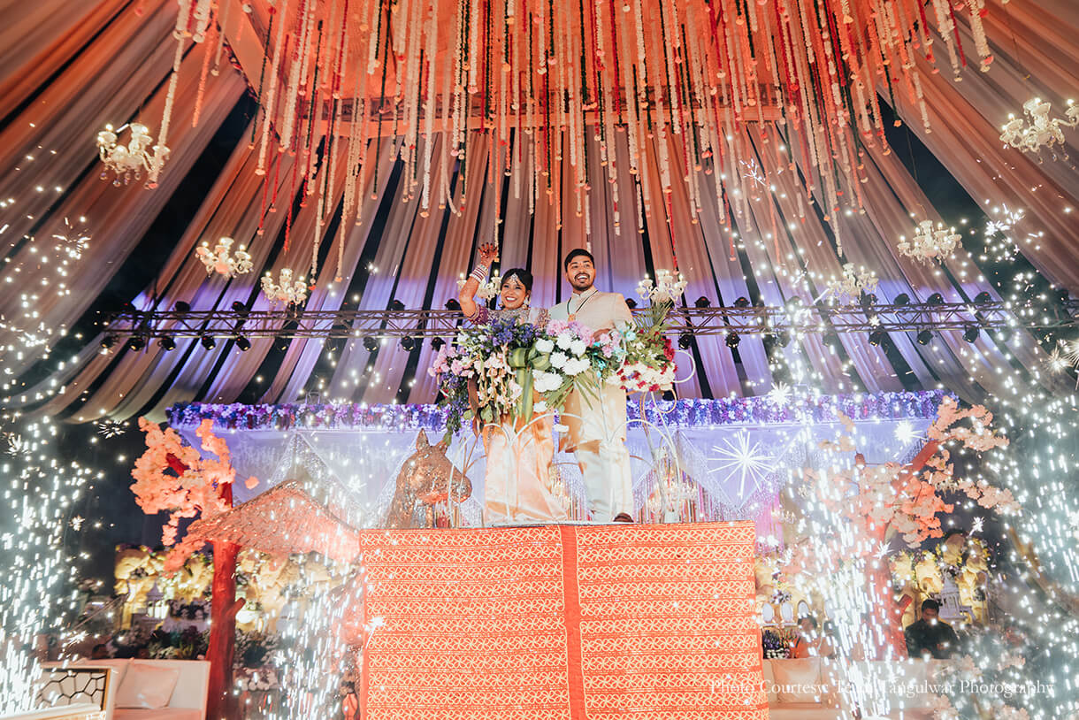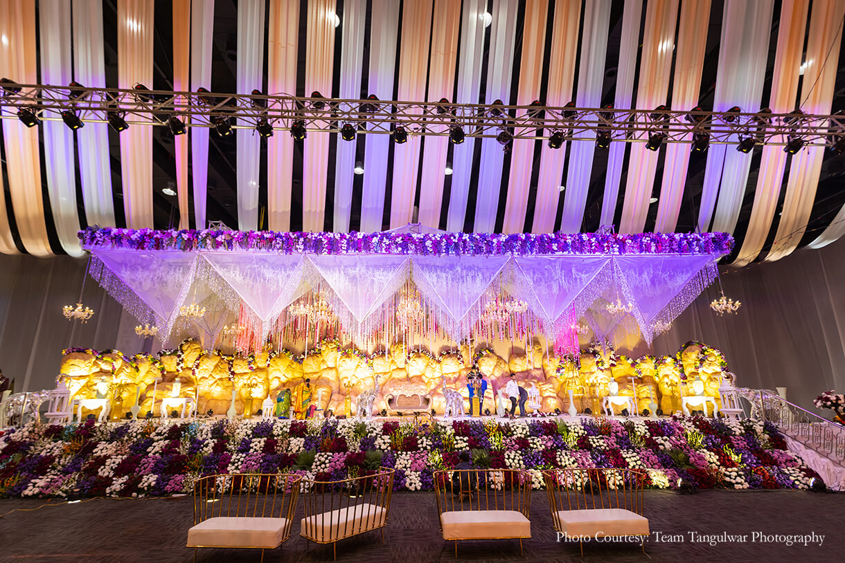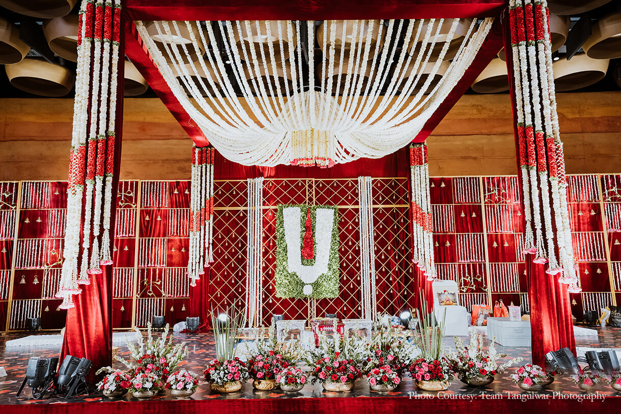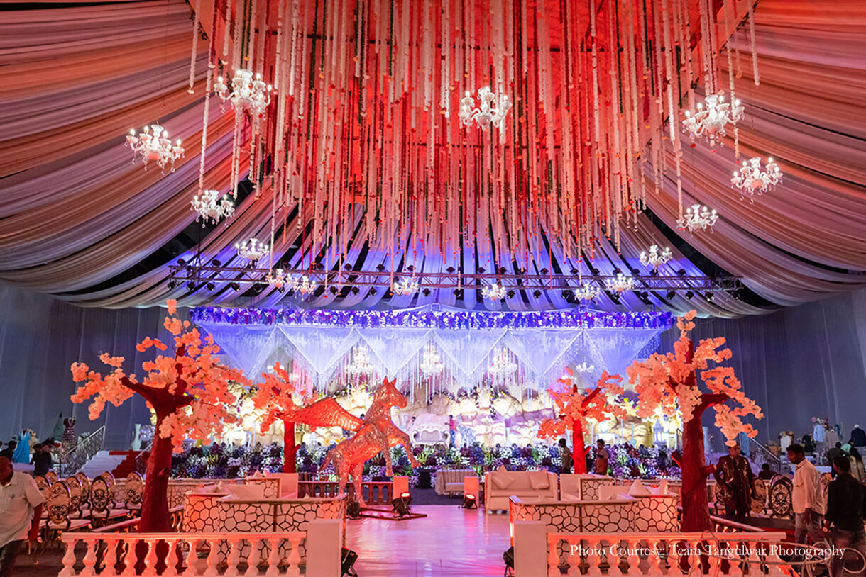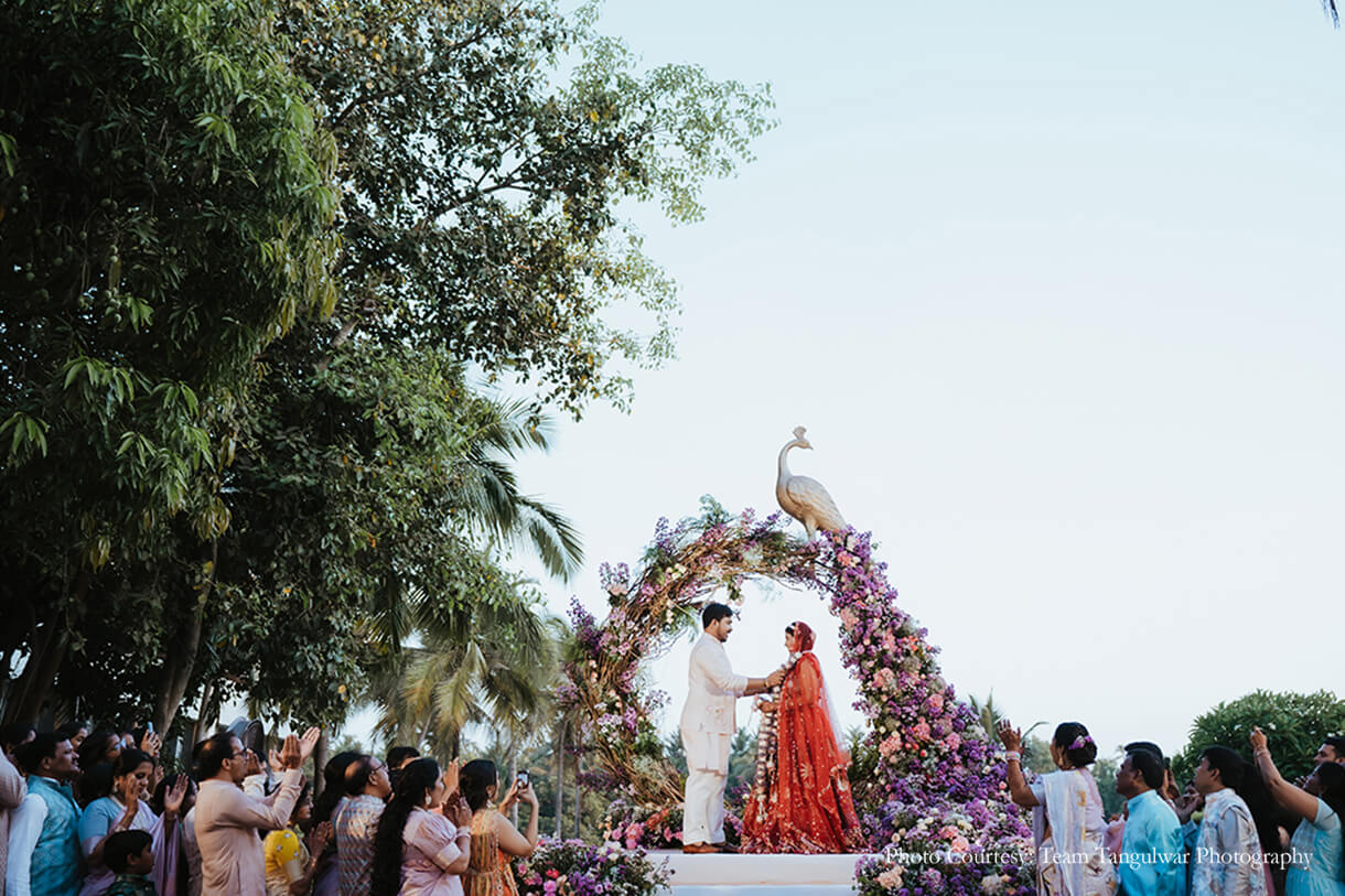 For the big day, nothing was left to chance! A huge white and red-hued floral wedding mandap dominated the wedding setup while the entryway reflected the same colour palette. Flanked by a red and gold backdrop, the couple and their families performed all the pre-wedding rituals. Right before the wedding, the couple also hosted a varmala ceremony outdoors decked up with purple blooms, a chrome aisle and a gold peacock.