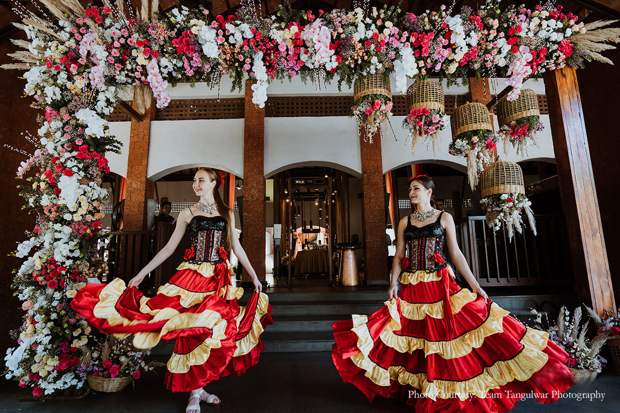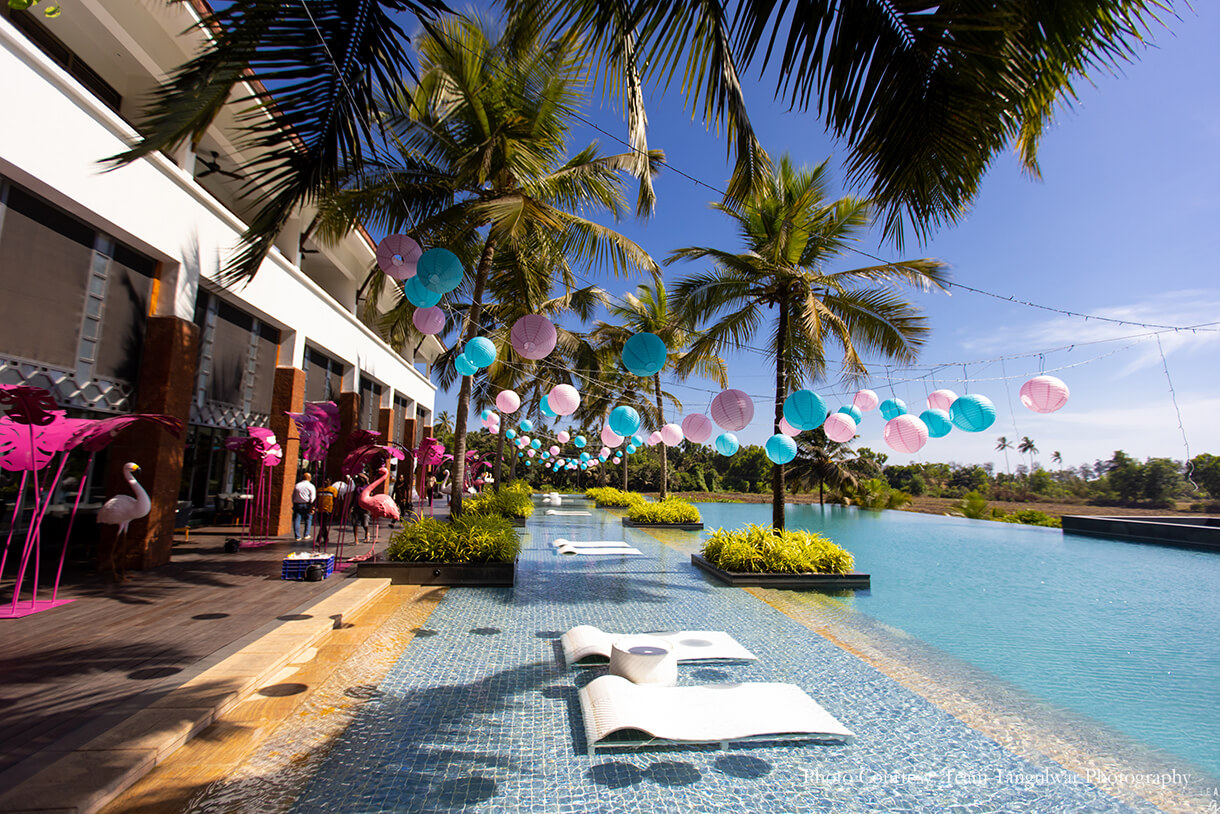 After the colorful mehndi, the guests let their hair down at the pool party where they splashed in the water, had fun with the quirky props and danced their hearts out. Decorating the entrance were two life-sized flamingos and large tropical monstera leaves painted pink.