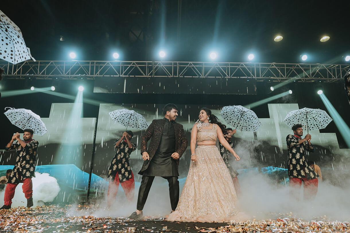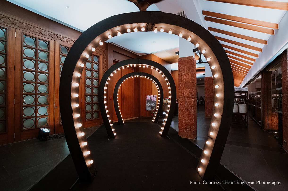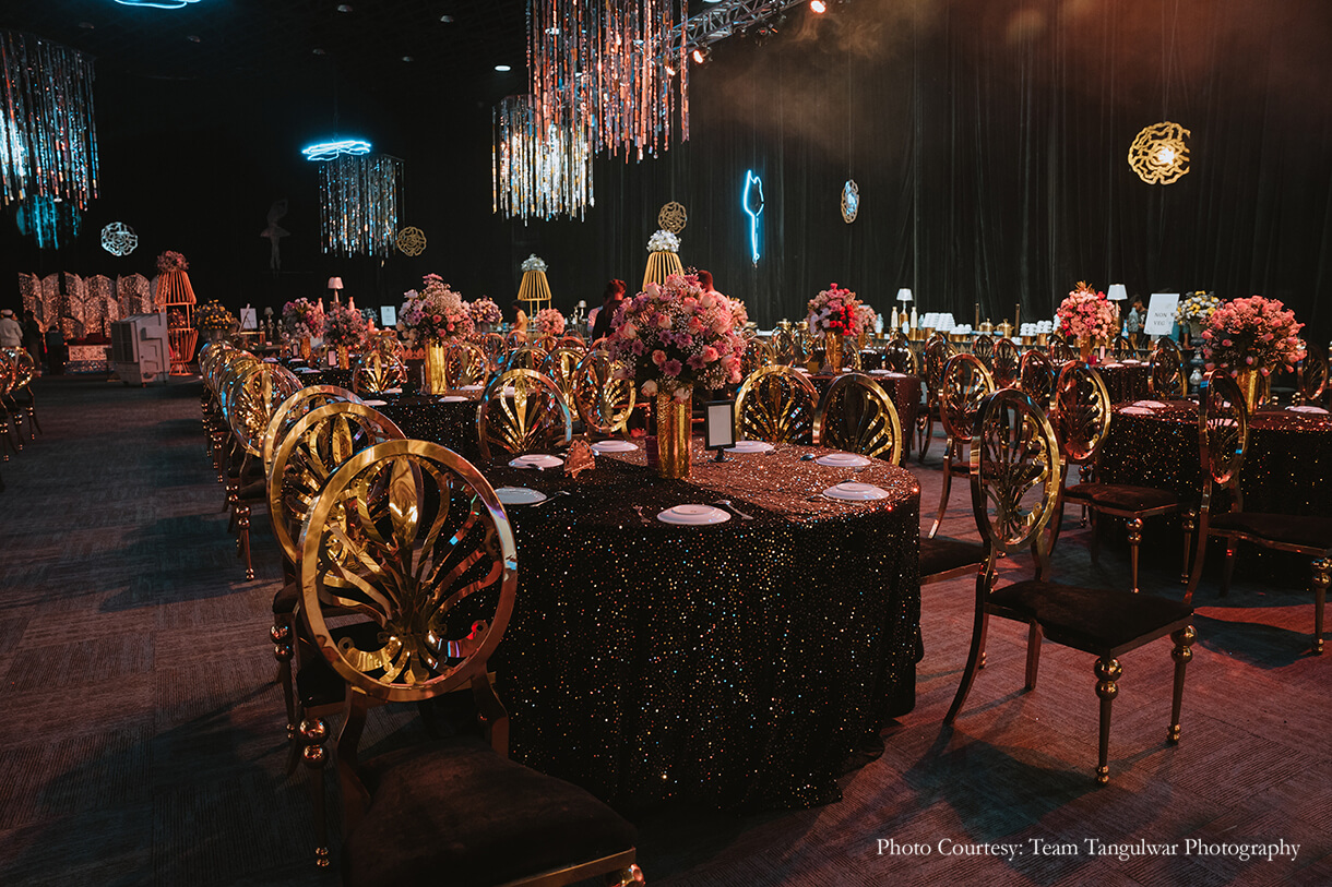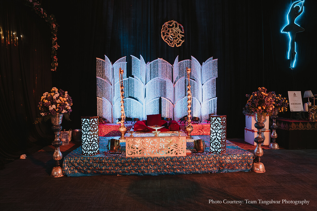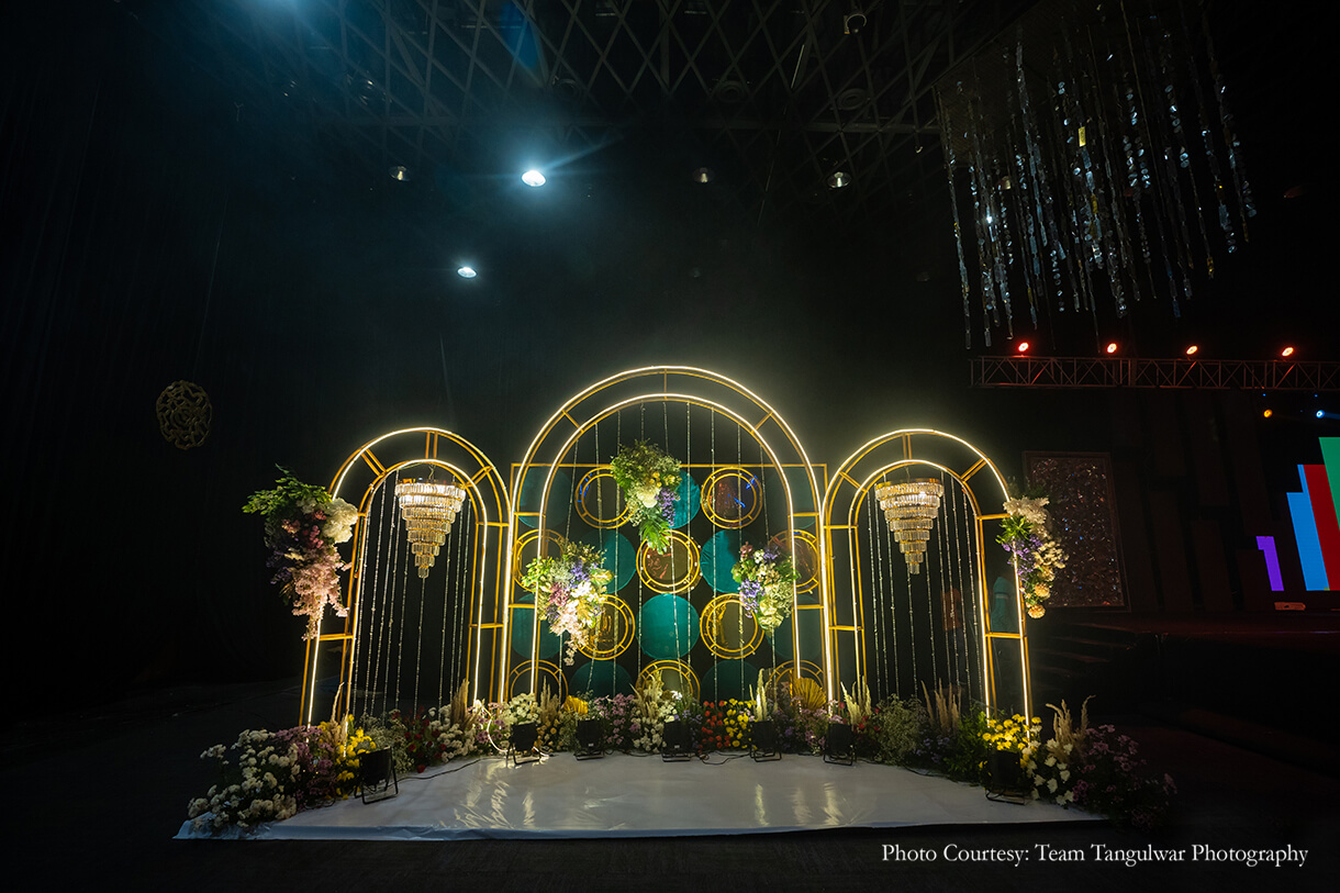 With a green and gold color palette, the sangeet was high on glitz. While the walls were a deep bottle green hue, the gold LED light contrasted beautifully. Adding to the beauty were delicate floral setups, sequins and crystal chandeliers.
