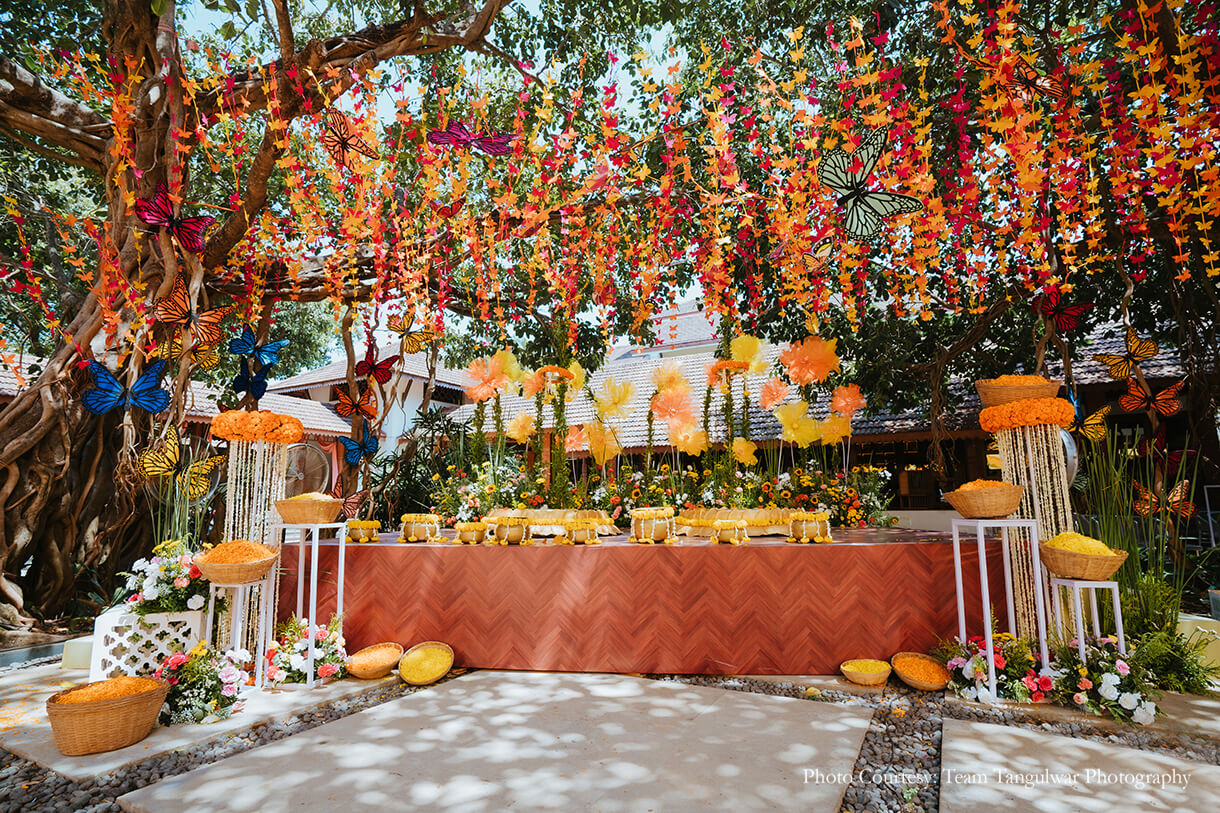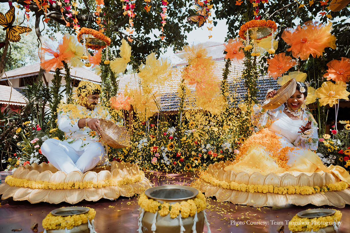 Swathed in hues of yellow and hosted under the sunny sky, the haldi brimmed with marigold blooms, rustic cane baskets and larger-than-life butterflies for a whimsical touch. Seated in a brass urlis, the couple were playfully slathered with turmeric to get them glowing for the wedding!