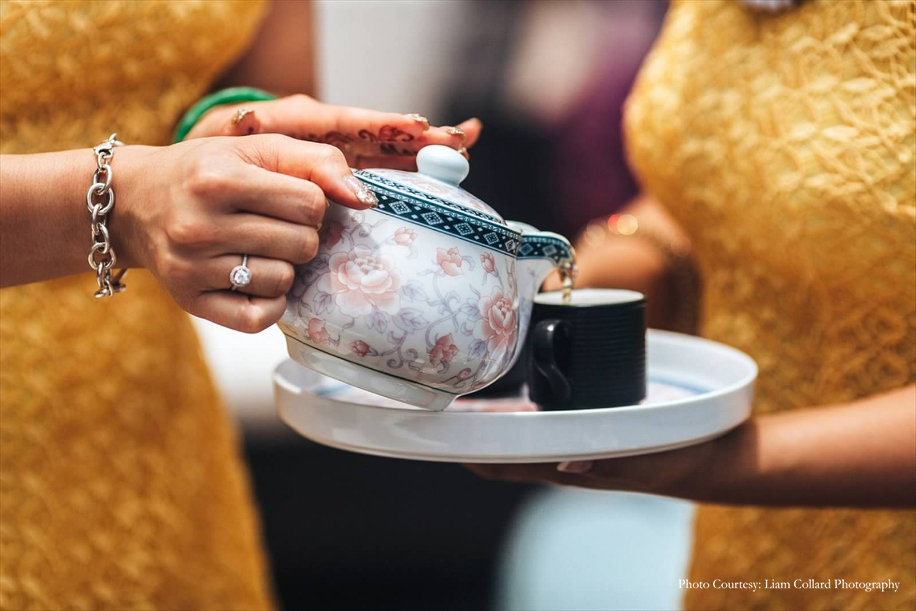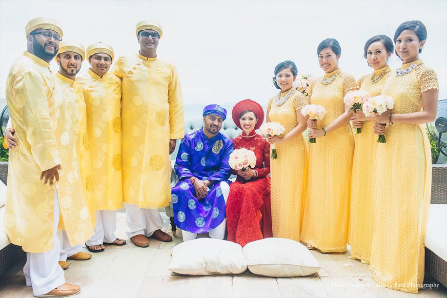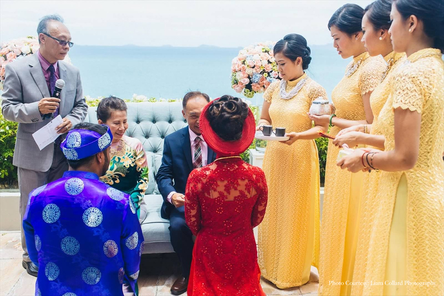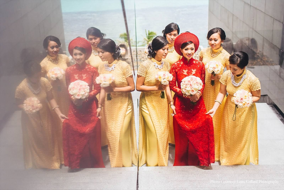 This spectacular ceremony was a beautiful blend of historic and contemporary traditions. The bride and groom took their vows and later served Chrysanthemum Tea as a sign of respect, starting with the eldest family members. This beautiful ceremony honors the family’s ancestors and relatives. The bride was a vision in her traditional red ensemble called ‘Ao Dai’ as she was escorted by her bridesmaids who matched her in their vibrant yellow outfits. The groom also wore a traditional blue ‘Ao Dai’ with a circular headdress called a Khan Dong. This couple marked the beginning of their new journey as they took their vows at a spot overlooking the azure seas.