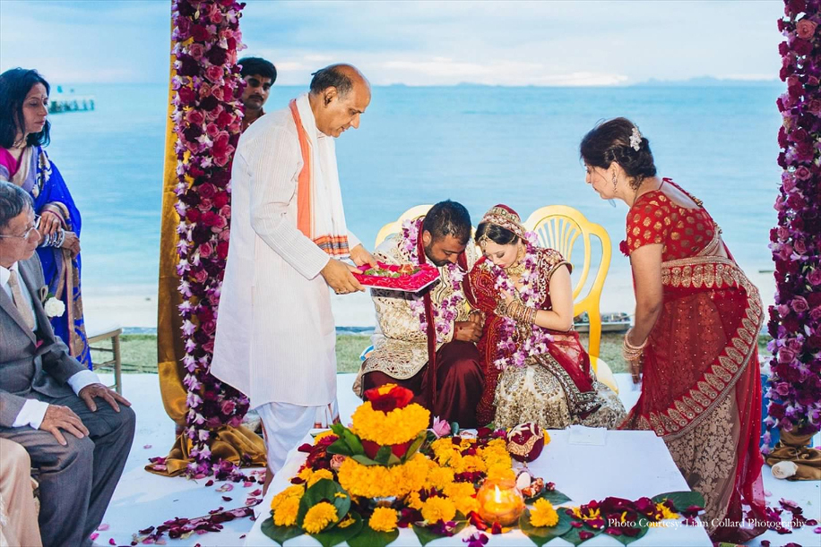 The wedding was organized right on the beach by the sea. The setting was breathtaking as they exchanged their vows outdoors in the mandap that was created using fresh lavenders, roses, white drapes and traditional arrangements. It was a perfect day setting for the traditional wedding.