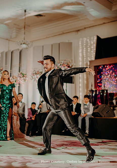 “Our rocking sangeet in the evening had everyone dancing. The cake cutting ceremony was followed by performances by our family and friends, and some great music by the BollyJammers. I wore a Shantanu & Nikhil gown for this event, and Chirag looked dapper in his suit from Diwan Saheb.”