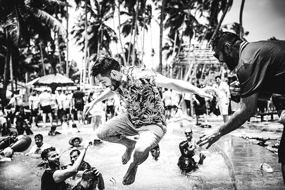 “The following morning we hosted a lively pool party where the decor was ruled by shades of red, blue, white and teal green, lending a vibrant magic to the swaying coconut trees Kerala is famous for. The entrance was decorated with an arch covered in leaves and lots of inverted umbrellas made for the roof in some areas. We even had some elements in gold, such as pineapples, repurposed bottles, and even test tubes which we used as flower holders! A section was dedicated to rain dance sessions, and, needless to say, this corner had guests flocking to it. A white Ritu Kumar dress was my outfit of my choice for this event, while Chirag wore a Ted Baker resort ensemble.”