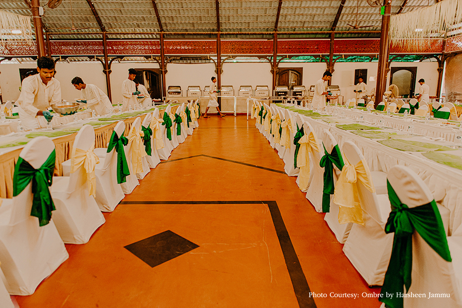 “Considering we were getting married in ‘God’s Own Country,’ we had to have a ‘sadhya,’ which is the traditional Kerala-style feast. This was easily one of the most delicious meals we have ever had, and gave everyone a chance to experience authentic Malayali cuisine. Everyone wore South Indian ensembles – the ladies wore sarees, and the men were dressed in lungis and kurtas.”