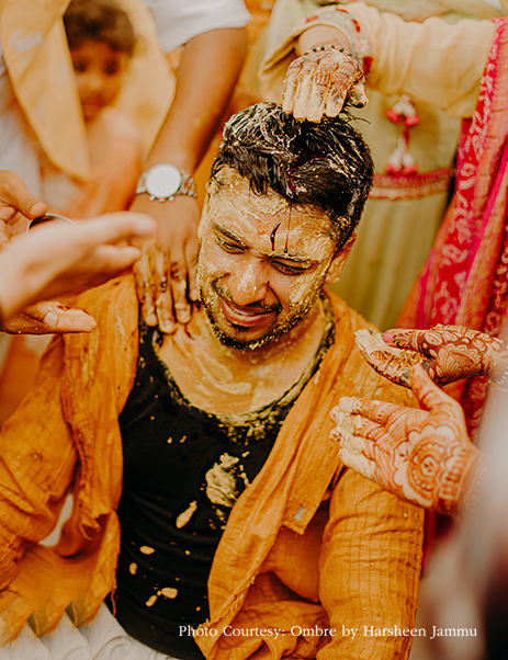 “Our haldi was an intimate affair, yet it packed in a lot of fun! Chirag and I both wore yellow outfits, and our loved ones had the time of their lives smearing us with turmeric paste.”