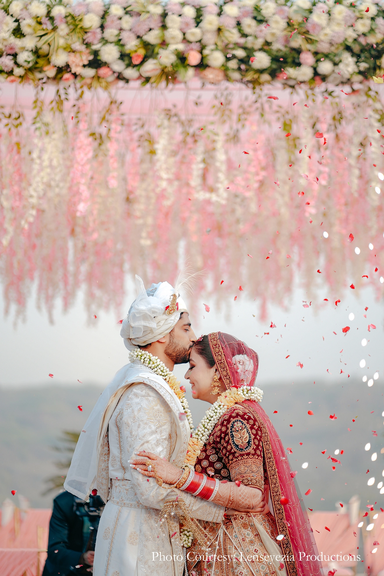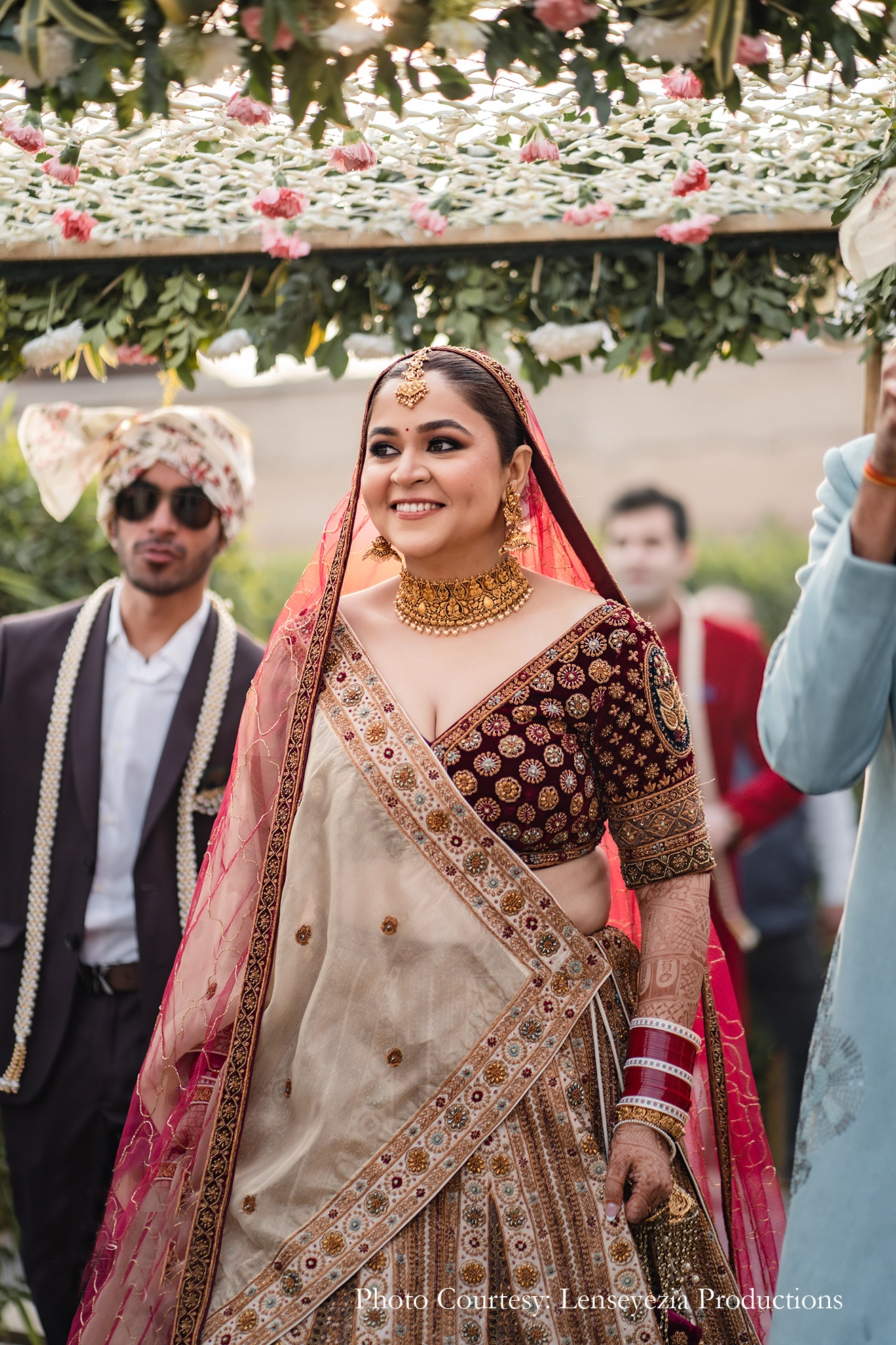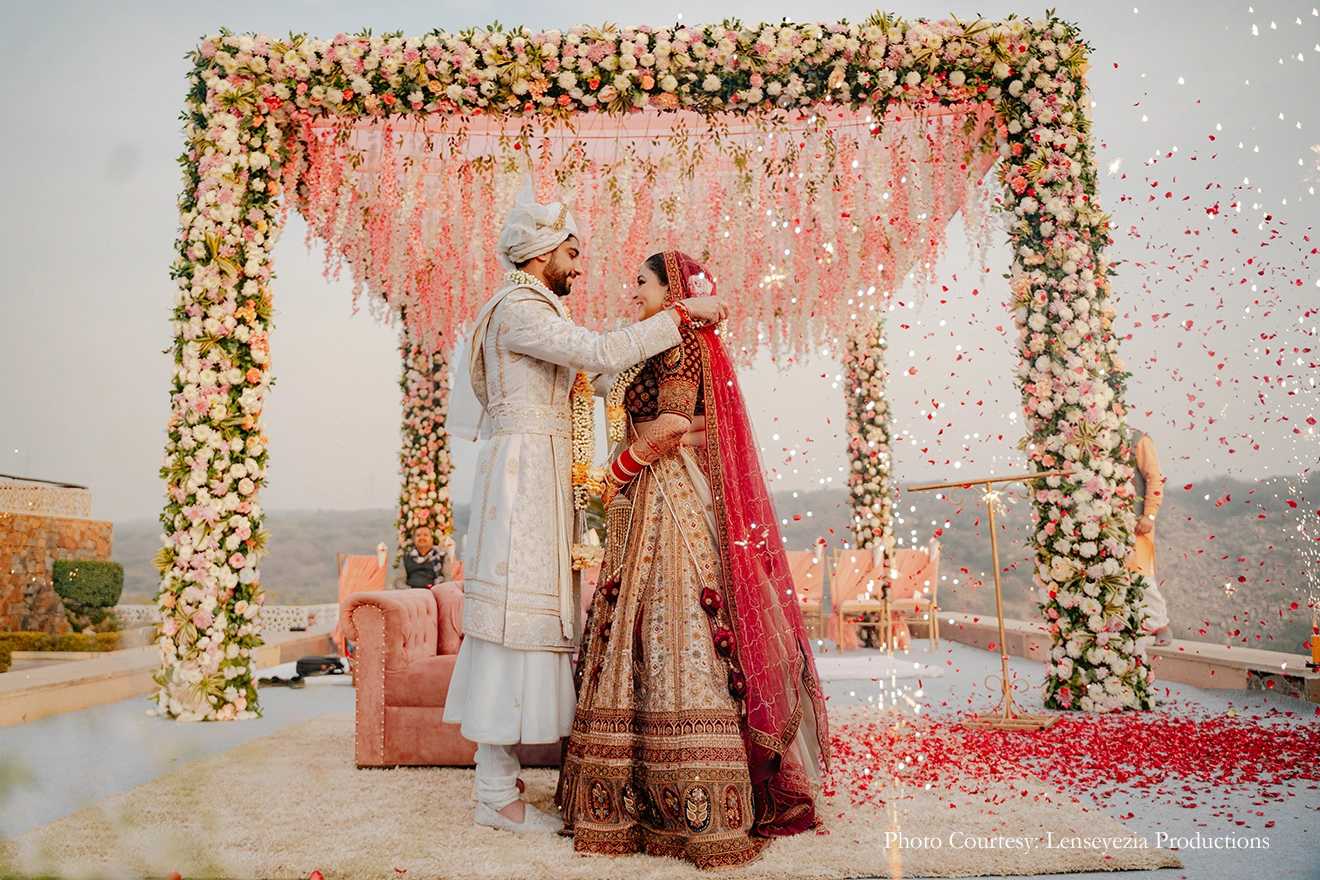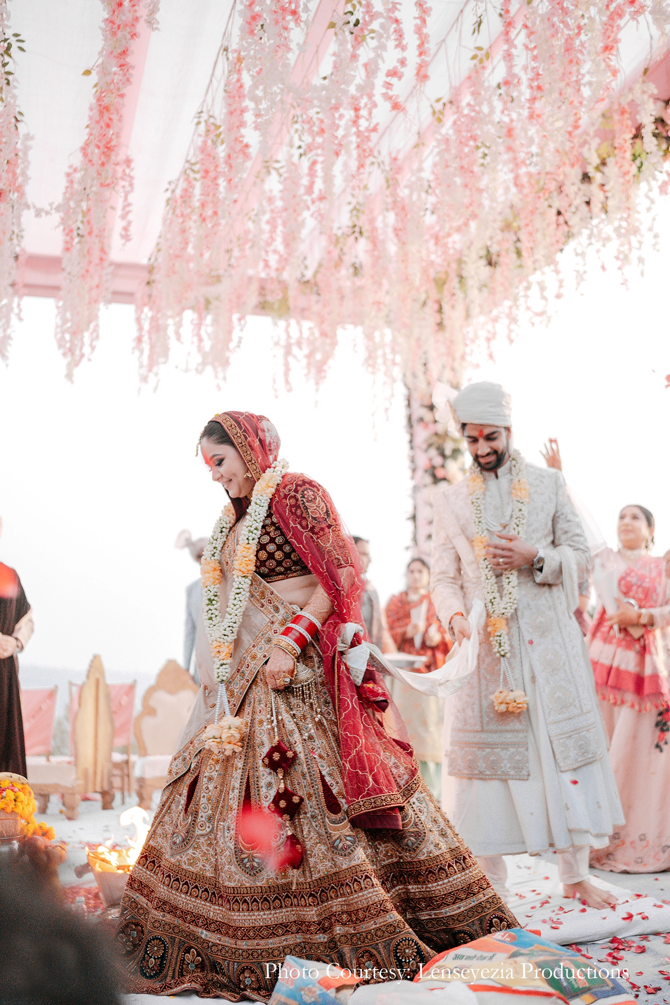 The sundowner wedding was a royal affair that kicked off with the groom’s grand arrival in a vintage Rolls Royce with a CO2 gun and an exuberant Punjabi baraat. Dressed in ivory and maroon, the bride made her entry on Lana Del Ray’s young and beautiful leaving everyone spellbound. It was a truly magical feeling as the teary-eyed couple saw each other as a bride and groom and vowed their eternal love in front of their loved ones.