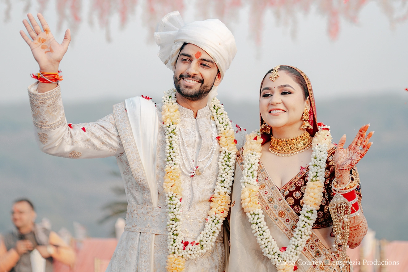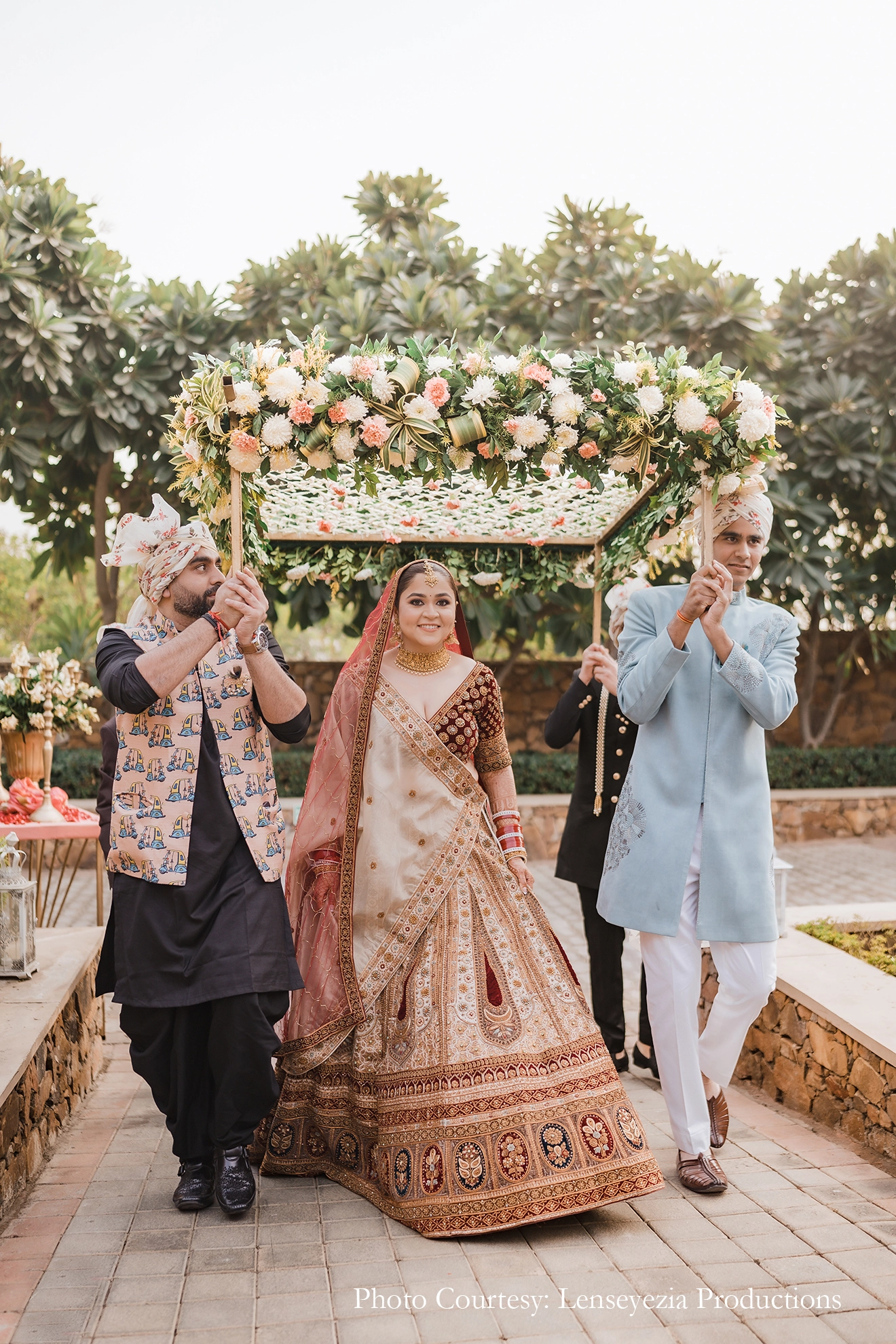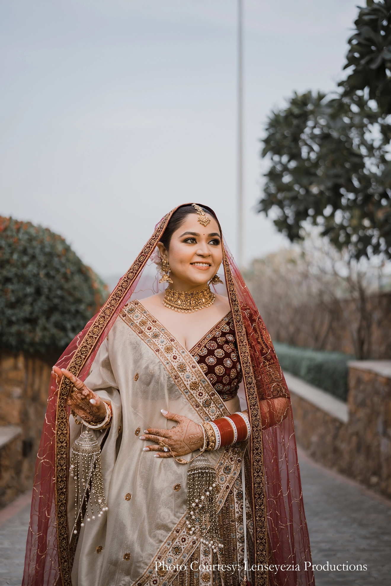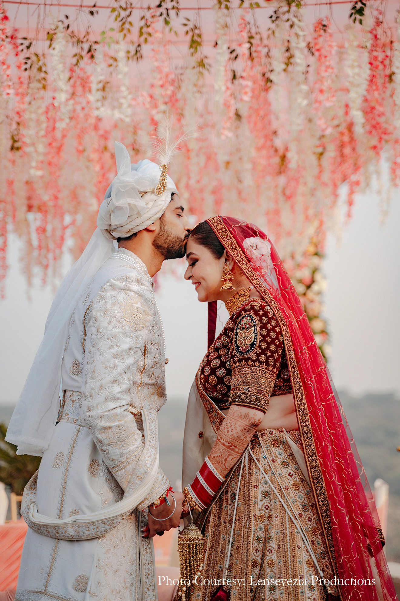 The sundowner wedding was a royal affair that kicked off with the groom’s grand arrival in a vintage Rolls Royce with a CO2 gun and an exuberant Punjabi baraat. Dressed in ivory and maroon, the bride made her entry on Lana Del Ray’s young and beautiful leaving everyone spellbound. It was a truly magical feeling as the teary-eyed couple saw each other as a bride and groom and vowed their eternal love in front of their loved ones.