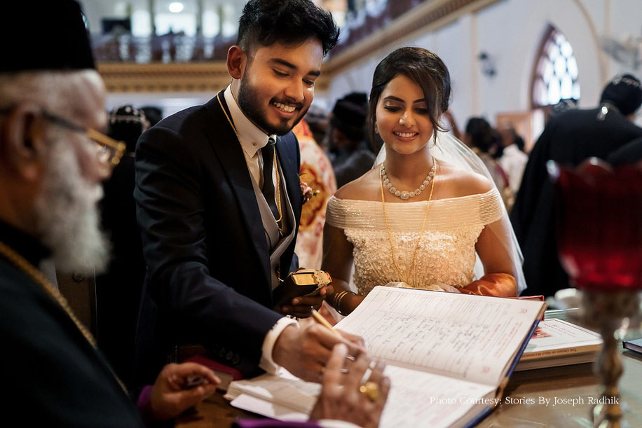 Varsha and Aadil’s wedding ceremony had a British Vintage theme. The white wedding took place at the St. George Orthodox Dayro Church in Kerala. The walls of which are adorned with beautiful oil paintings that created a wonderful ambiance. The ceremony was followed by a reception where the theme was evoked in elegant pastel floral decor. All the moments from the wedding ceremony were deftly captured by Stories by Joseph Radhik.